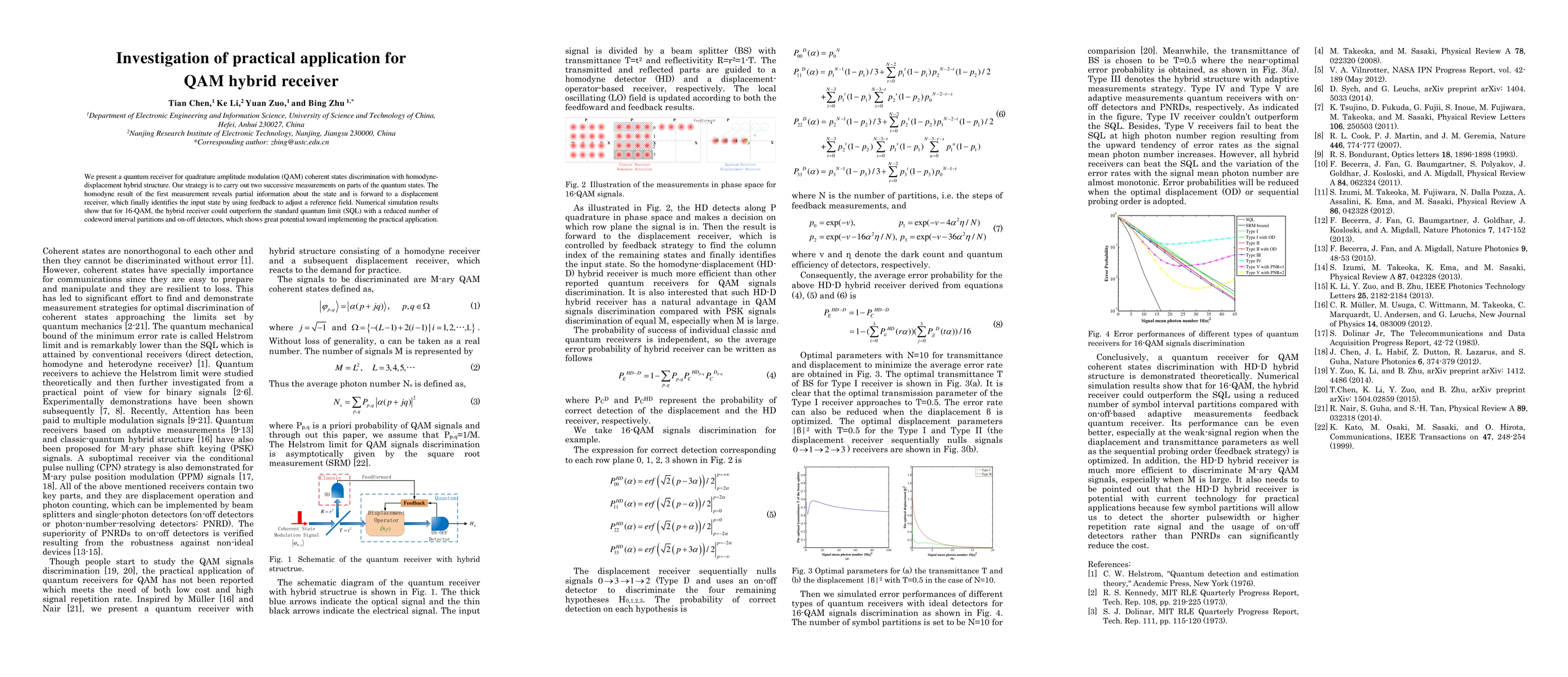 This paper proposes a quantum receiver for QAM coherent states discrimination using a hybrid homodyne-displacement structure. Simulation results indicate that the hybrid receiver can outperform the standard quantum limit for 16-QAM, demonstrating practical application potential.