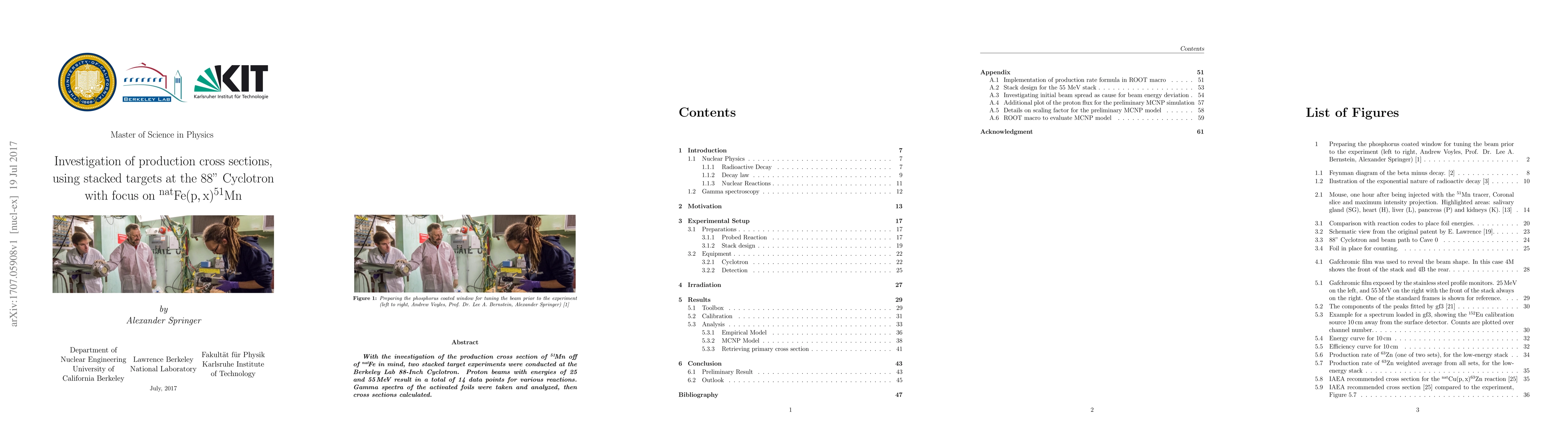With the investigation of the production cross section of $\ ^{51}\rm Mn$ off of $\ ^{\rm nat}\rm Fe$ in mind, two stacked target experiments were conducted at the Berkeley Lab 88-Inch Cyclotron. Proton beams with energies of $25$ and $55\,\rm MeV$ result in a total of 14 data points for various reactions. Gamma spectra of the activated foils were taken and analyzed, then cross sections calculated.