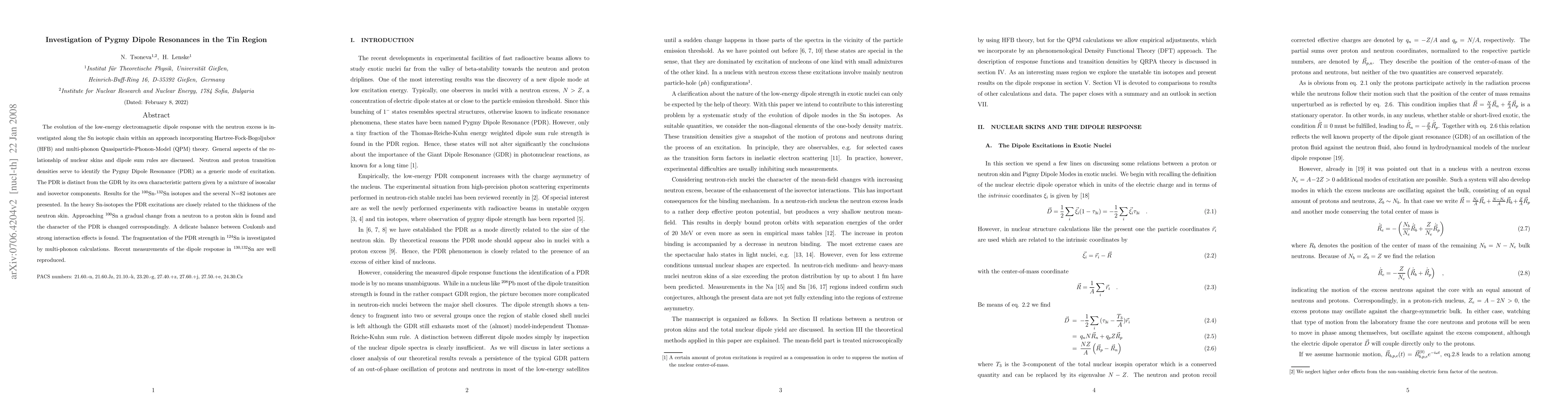 This paper investigates the Pygmy Dipole Resonance (PDR) in tin isotopes using HFB and QPM theories, revealing its distinct characteristics from the Giant Dipole Resonance (GDR). The study finds that PDR excitations in heavy Sn isotopes correlate with the neutron skin thickness, while a transition from neutron to proton skin in lighter isotopes alters the PDR's character, showcasing a balance between Coulomb and strong interaction effects.