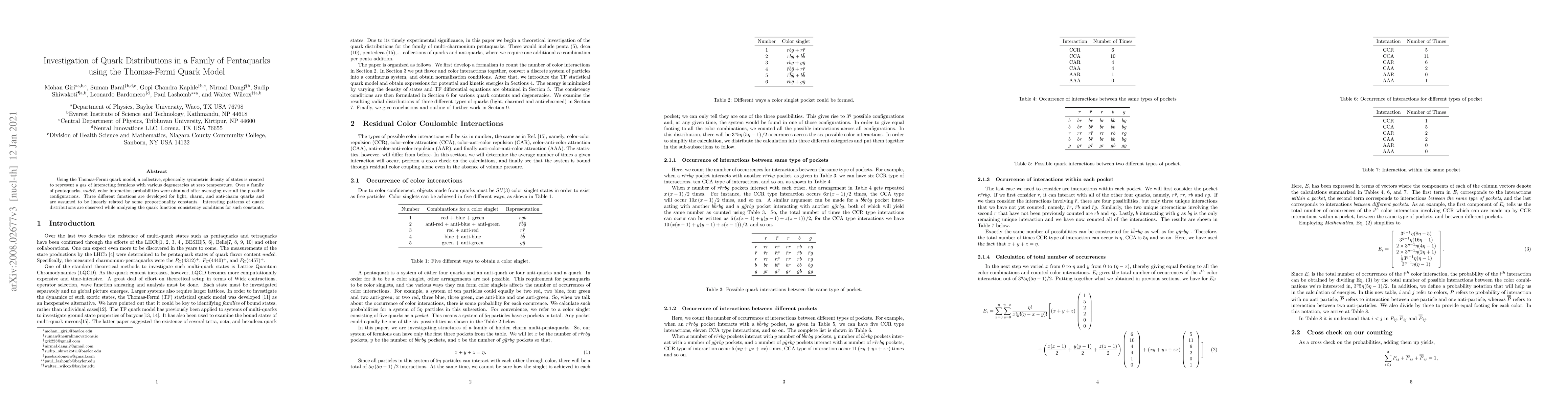 Using the Thomas-Fermi quark model, a collective, spherically symmetric density of states is created to represent a gas of interacting fermions with various degeneracies at zero temperature. Over a family of multi-pentaquarks, color interaction probabilities are obtained after averaging over all the possible configurations. It is found that three different Thomas-Fermi functions are necessary for light, charm, and anti-charm quarks. These are assumed to be linearly related by proportionality constants resulting in consistency conditions. We analyze these conditions and find that they lead to an interesting pattern of spherical quark distributions.