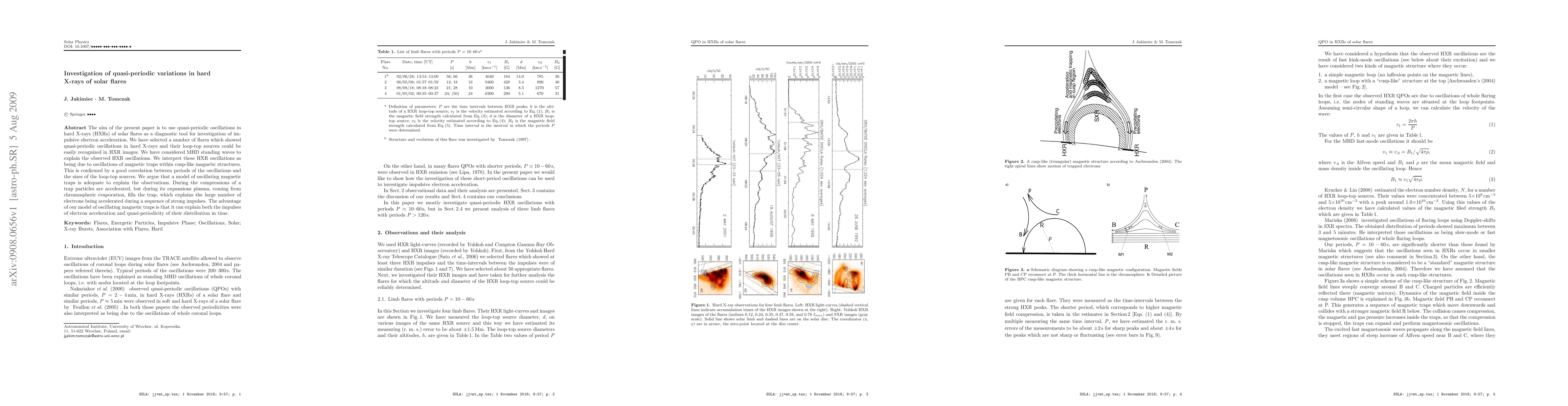This paper investigates quasi-periodic oscillations in hard X-rays from solar flares, using them to study impulsive electron acceleration. The authors propose that these oscillations are due to magnetic traps within cusp-like structures, explaining both the impulses and the quasi-periodicity through a model of oscillating magnetic traps.