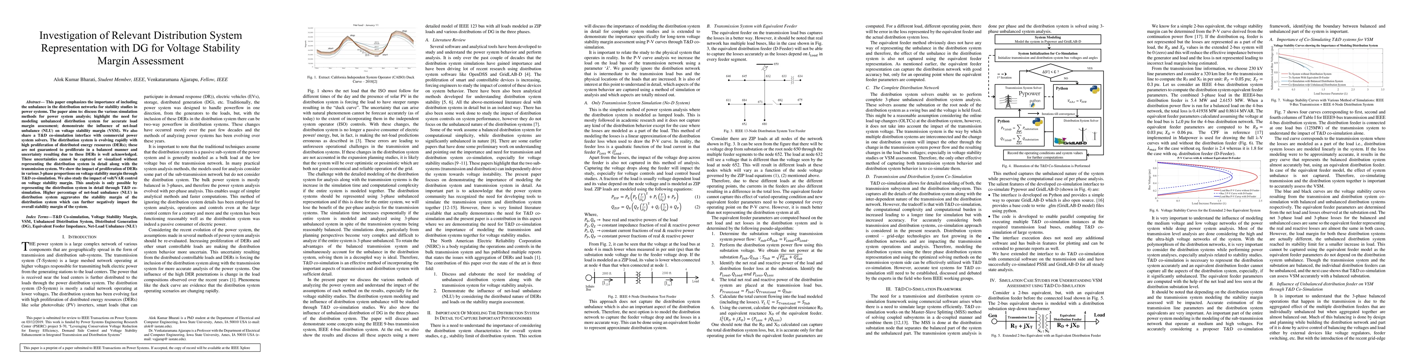 This paper investigates the representation of unbalanced distribution systems for voltage stability margin assessment, emphasizing the impact of distributed energy resources (DERs) proliferation on stability. It highlights the necessity of detailed T&D co-simulation for accurate load margin assessment and demonstrates the adverse effects of net-load unbalance on voltage stability margin.