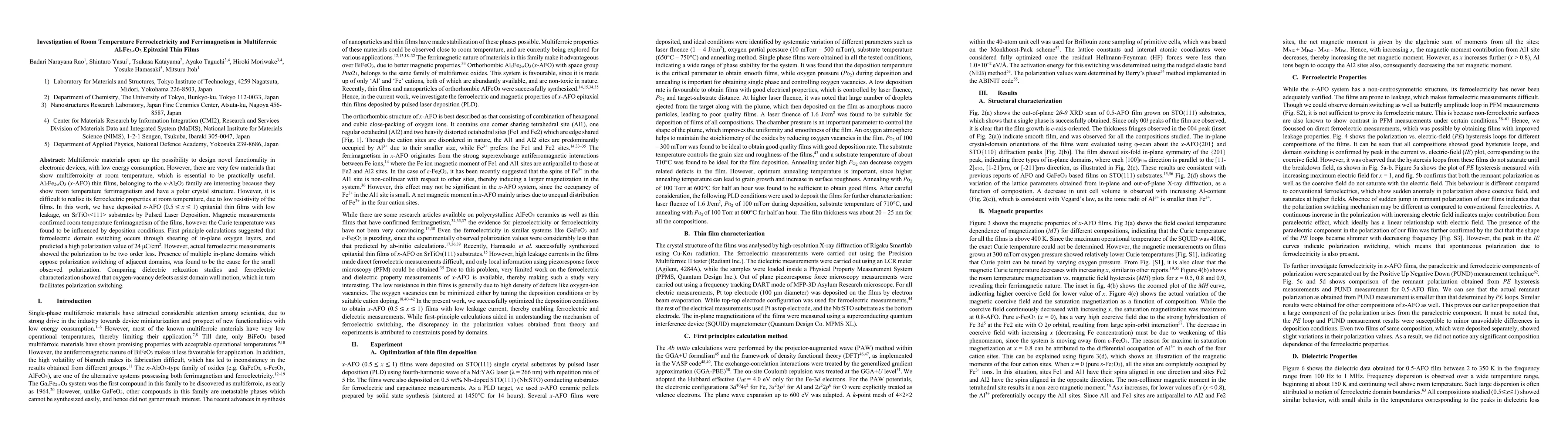 This study investigates AlxFe2-xO3 epitaxial thin films deposited via Pulsed Laser Deposition, which exhibit room temperature ferrimagnetism but have a low ferroelectric polarization due to in-plane domain interactions and oxygen-vacancy defects that hinder switching. First principle calculations predict high polarization, but experimental measurements reveal significantly lower values.