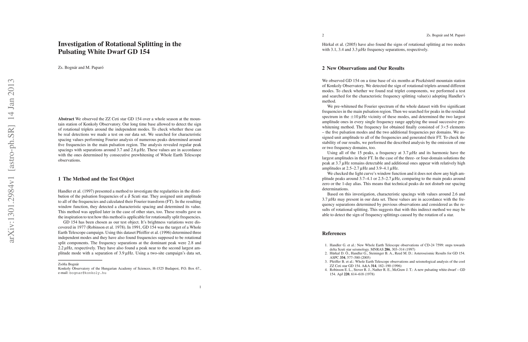 This study observed the ZZ Ceti star GD 154 over a season, detecting rotational triplets indicative of rotational splitting in its pulsation modes. Fourier analysis revealed regular peak spacings, confirming the presence of rotational splitting with separations around 3.7 and 2.6 microHz.