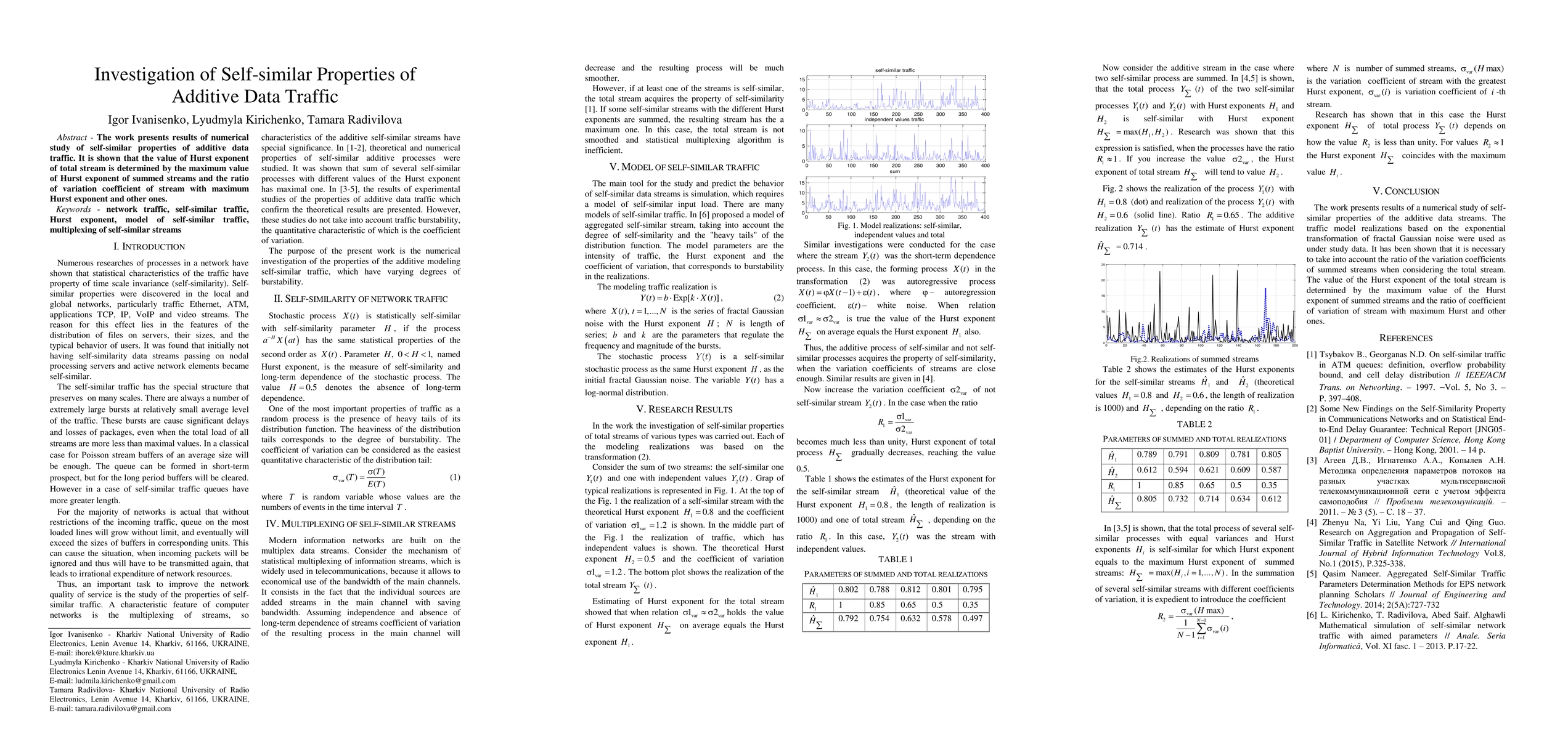 The work presents results of numerical study of self-similar properties of additive data traffic. It is shown that the value of Hurst exponent of total stream is determined by the maximum value of Hurst exponent of summed streams and the ratio of variation coefficient of stream with maximum Hurst exponent and other ones.