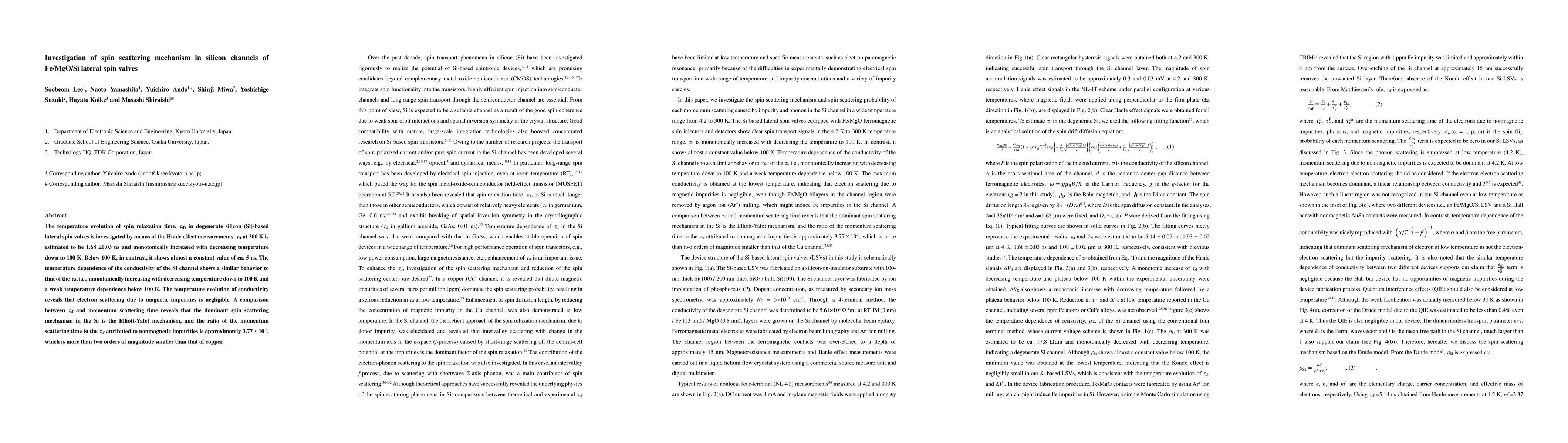 Researchers investigated spin relaxation time in silicon channels of Fe/MgO/Si lateral spin valves, finding that it increases with decreasing temperature until 100K, then stays constant.
