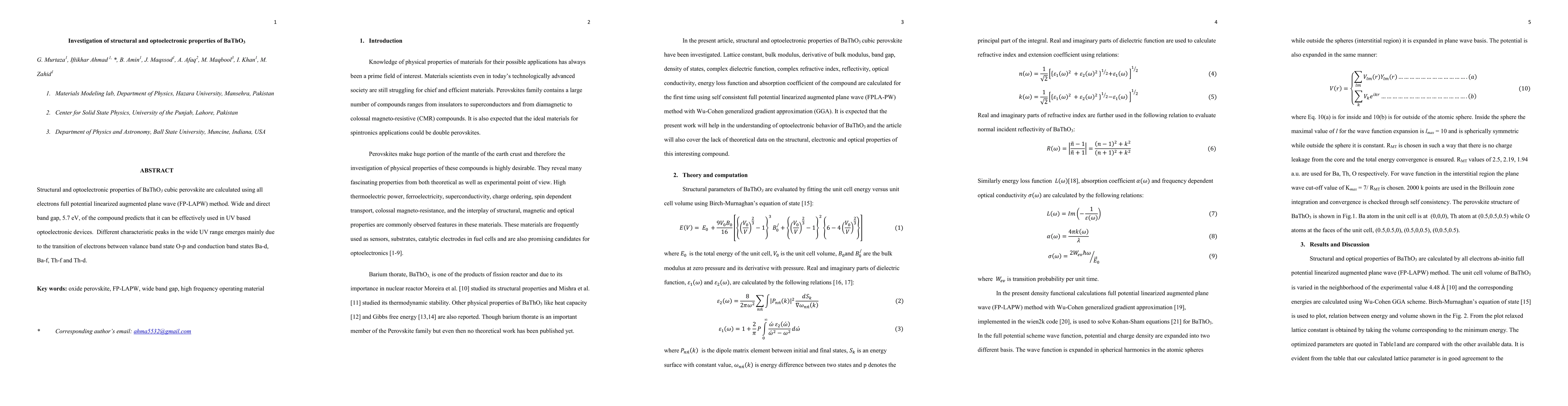 Summary: The BaThO3 cubic perovskite exhibits a wide, direct band gap of 5.7 eV, suggesting its potential for UV-based optoelectronic devices, with characteristic UV peaks arising from electron transitions between O-p, Ba-d, Ba-f, Th-f, and Th-d states.