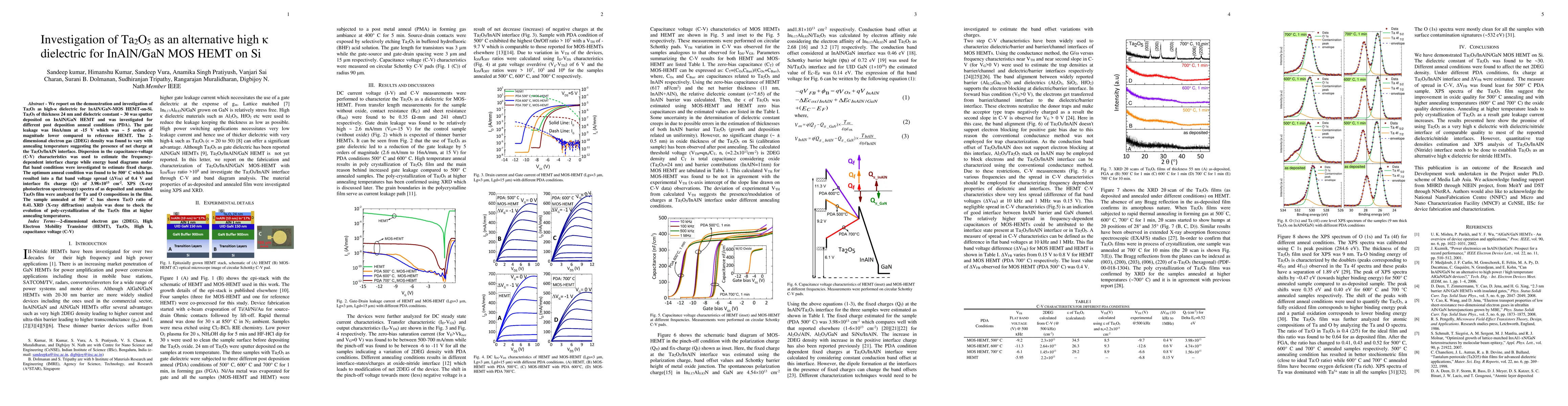 This paper investigates Ta2O5 as a high-k dielectric for InAlN/GaN MOS HEMT on Si, demonstrating low gate leakage and variable 2DEG density with annealing. The optimal anneal condition at 500°C results in a flat band voltage spread of 0.4 V and an interface fixed charge of 3.98x10^13 cm^-2, confirmed by XPS and XRD analyses.