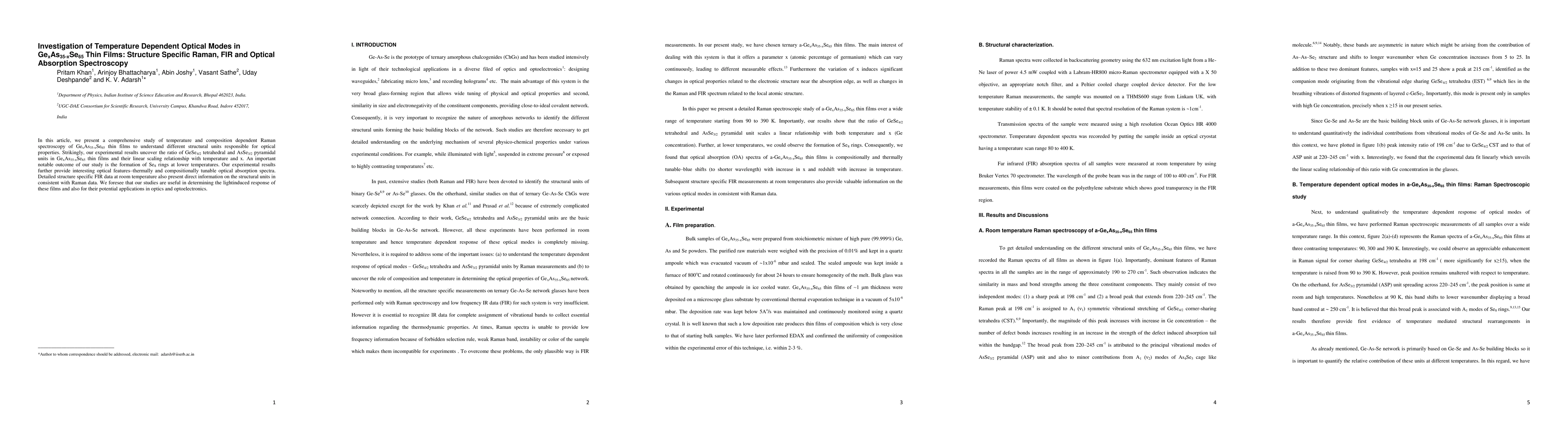 This paper investigates temperature-dependent optical modes in GexAs35-xSe65 thin films using Raman, FIR, and optical absorption spectroscopy, revealing the ratio of GeSe4/2 and AsSe3/2 units and their temperature-composition relationship. The study also highlights the formation of Se8 rings at lower temperatures and provides insights into the films' tunable optical absorption properties.