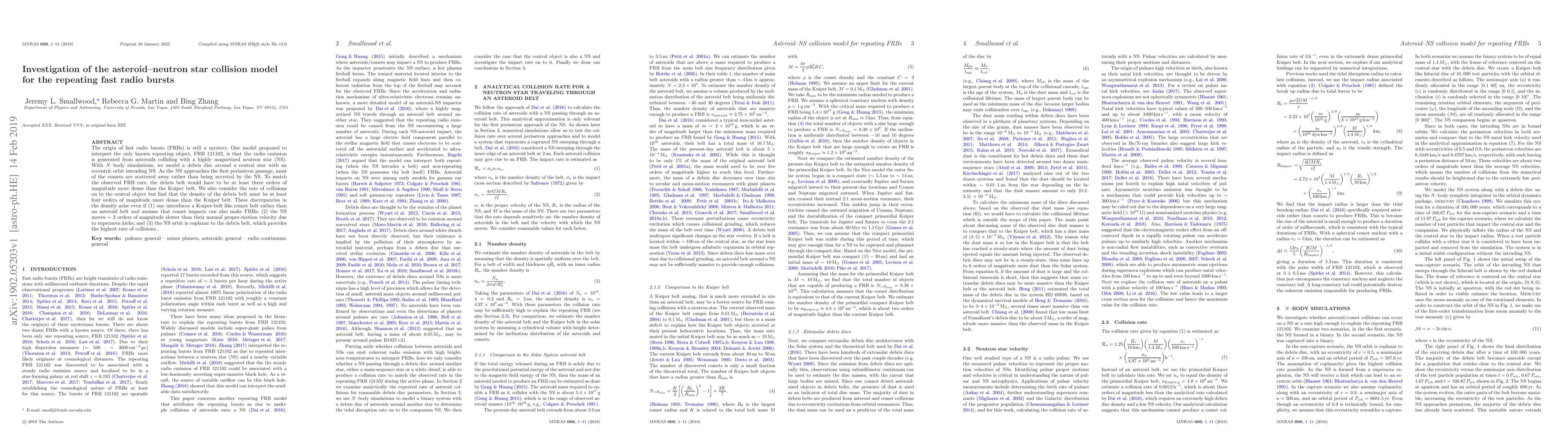 This paper explores the asteroid-neutron star collision model for the repeating fast radio burst (FRB) FRB 121102, finding that the required density of the debris belt is three to four orders of magnitude greater than the Kuiper belt to match observed FRB rates, despite various adjustments to the model parameters.