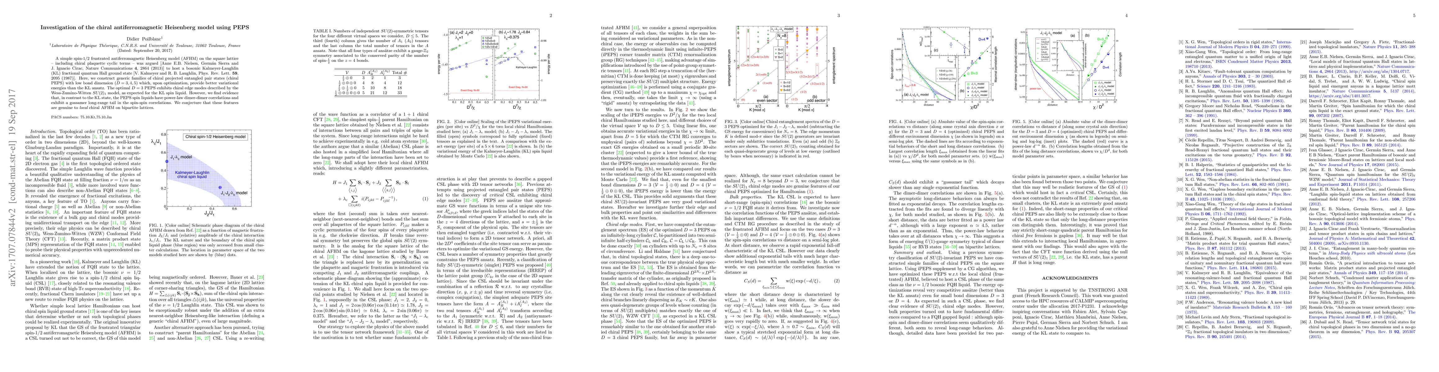 A simple spin-$1/2$ frustrated antiferromagnetic Heisenberg model (AFHM) on the square lattice - including chiral plaquette cyclic terms - was argued [Anne E.B. Nielsen, German Sierra and J. Ignacio Cirac, Nature Communications $\bf 4$, 2864 (2013)] to host a bosonic Kalmeyer-Laughlin (KL) fractional quantum Hall ground state [V. Kalmeyer and R. B. Laughlin, Phys. Rev. Lett. $\bf 59$, 2095 (1987)]. Here, we construct generic families of chiral projected entangled pair states (chiral PEPS) with low bond dimension ($D=3,4,5$) which, upon optimization, provide better variational energies than the KL ansatz. The optimal $D=3$ PEPS exhibits chiral edge modes described by the Wess-Zumino-Witten $SU(2)_1$ model, as expected for the KL spin liquid. However, we find evidence that, in contrast to the KL state, the PEPS spin liquids have power-law dimer-dimer correlations and exhibit a gossamer long-range tail in the spin-spin correlations. We conjecture that these features are genuine to local chiral AFHM on bipartite lattices.
