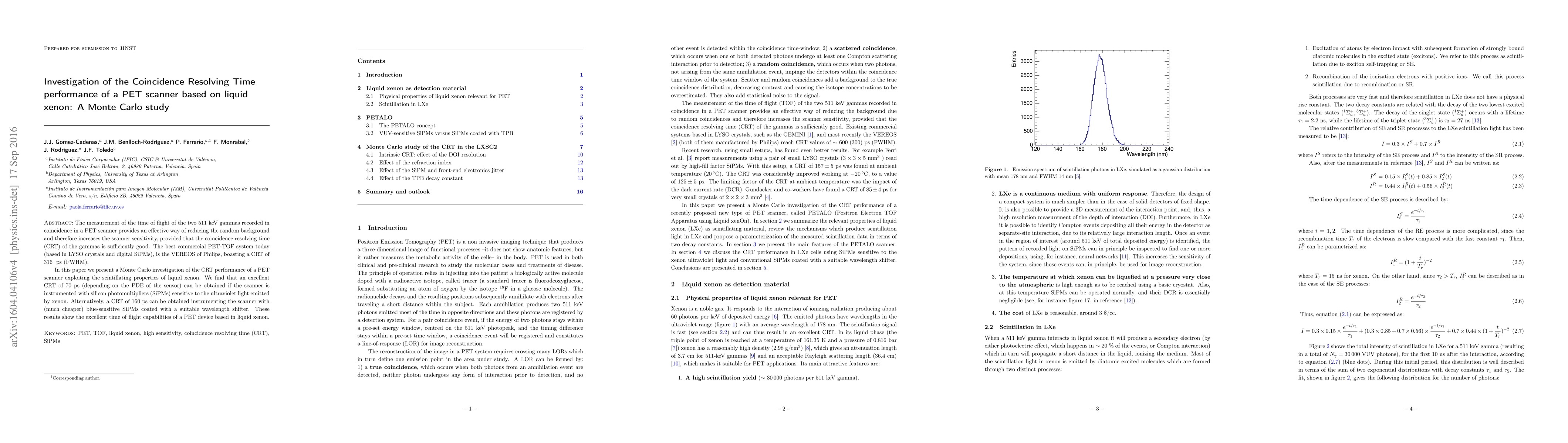 This paper investigates the coincidence resolving time (CRT) performance of a PET scanner using liquid xenon through Monte Carlo simulations. The study finds that liquid xenon PET scanners can achieve a CRT of 70 ps with silicon photomultipliers (SiPMs) or 160 ps with cheaper blue-sensitive SiPMs, showcasing the potential of liquid xenon for enhancing PET scanner sensitivity.