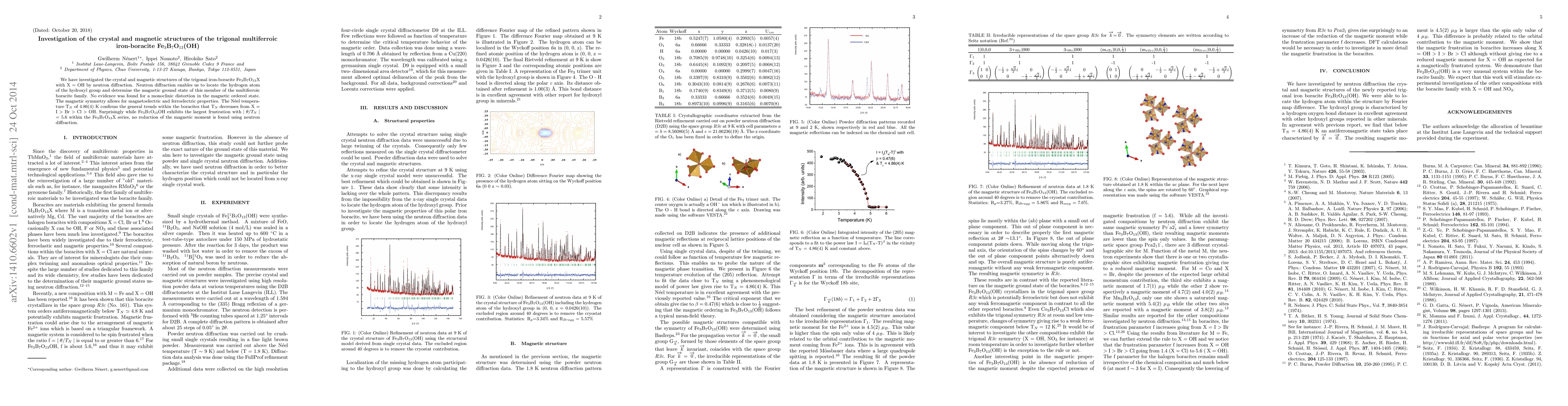 We have investigated the crystal and magnetic structures of the trigonal iron-boracite Fe3B7O13X with X = OH by neutron diffraction. Neutron diffraction enables us to locate the hydrogen atom of the hydroxyl group and determine the magnetic ground state of this member of the multiferroic boracite family. No evidence was found for a monoclinic distortion in the magnetic ordered state. The magnetic symmetry allows for magnetoelectric and ferroelectric properties. The N/'eel tempera- ture TN of 4.86(4) K confirms the general trends within the boracites that TN decreases from X = I > Br > Cl > OH. Surprisingly while Fe3B7O13OH exhibits the largest frustration with $|\theta/T_N| = 5.6$ within the Fe3B7O13X series, no reduction of the magnetic moment is found using neutron diffraction.