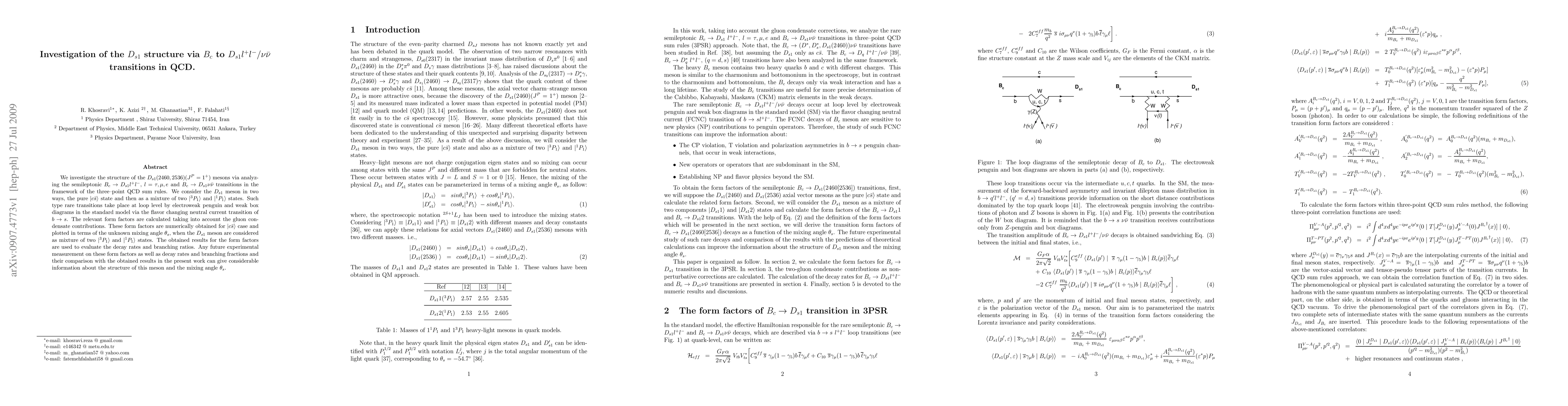 We investigate the structure of the $D_{s1}(2460,2536) (J^P=1^+)$ mesons via analyzing the semileptonic $B_{c}\to D_{s1}l^+l^-$, $l=\tau, \mu, e$ and $B_{c}\to D_{s1}\nu\bar{\nu}$ transitions in the framework of the three--point QCD sum rules. We consider the $D_{s1}$ meson in two ways, the pure $|c\bar{s}>$ state and then as a mixture of two $|^3P_1>$ and $|^1P_1>$ states. Such type rare transitions take place at loop level by electroweak penguin and weak box diagrams in the standard model via the flavor changing neutral current transition of $b \to s$. The relevant form factors are calculated taking into account the gluon condensate contributions. These form factors are numerically obtained for $|c\bar s>$ case and plotted in terms of the unknown mixing angle $\theta_s$, when the $D_{s1}$ meson are considered as mixture of two $|^3P_1>$ and $|^1P_1>$ states. The obtained results for the form factors are used to evaluate the decay rates and branching ratios. Any future experimental measurement on these form factors as well as decay rates and branching fractions and their comparison with the obtained results in the present work can give considerable information about the structure of this meson and the mixing angle $\theta_s$.