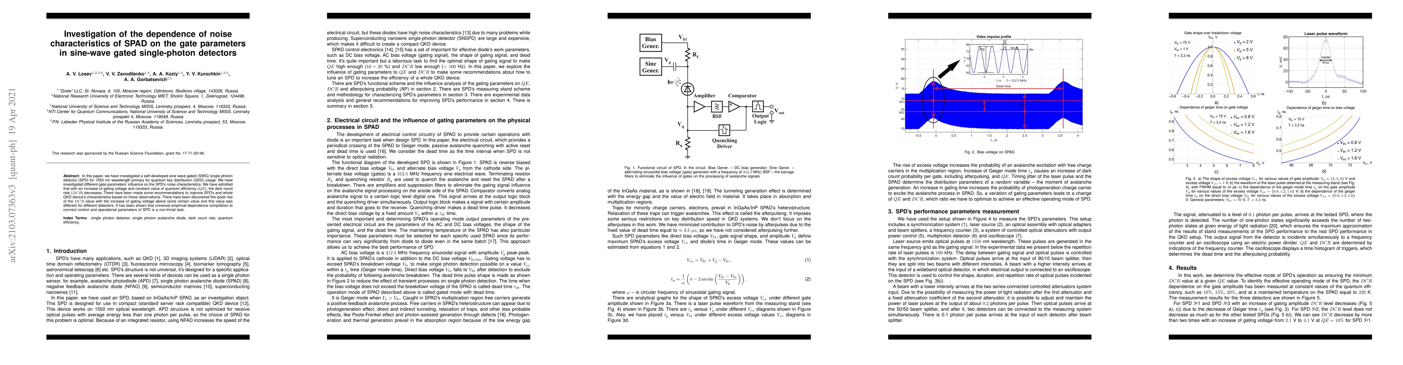 In this paper, we have investigated a self-developed sine wave gated (SWG) single-photon detector (SPD) for 1550 nm wavelength primary for quantum key distribution (QKD) usage. We have investigated different gate parameters` influence on the SPD`s noise characteristics. We have admitted that with an increase of gating voltage and constant value of quantum efficiency (QE), the dark count rate (DCR) decreases. There have been made some recommendations to improve SPD`s and whole QKD device's characteristics based on these observations. There have been discovered the quick rise of the DCR value with the increase of gating voltage above some certain value and this value was different for different detectors. It has been shown that universal empirical dependence compilation to connect control and operational parameters of SPD is a non-trivial task.