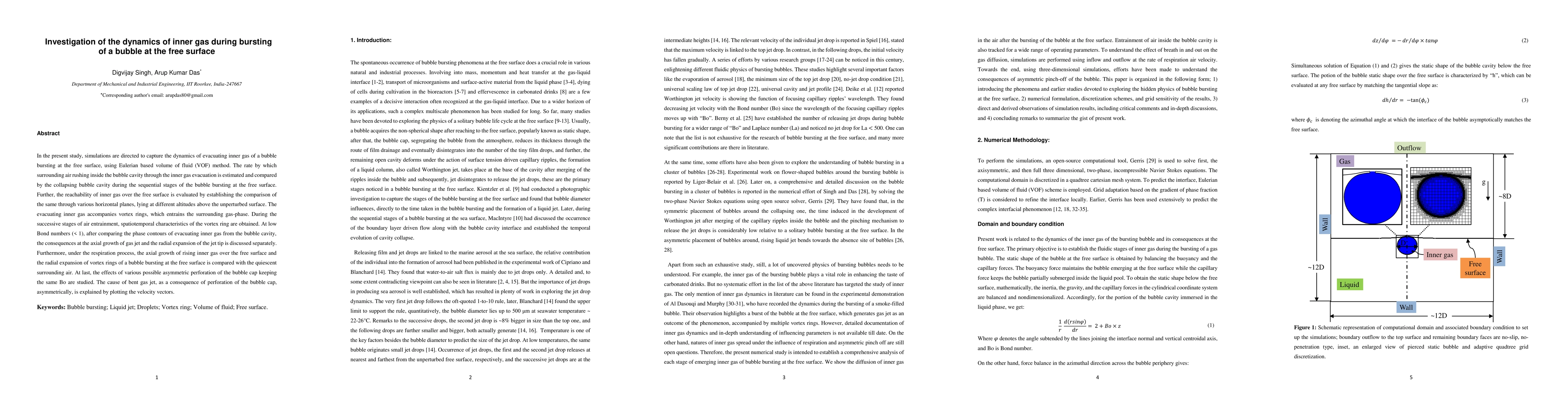 In the present study, simulations are directed to capture the dynamics of evacuating inner gas of a bubble bursting at the free surface, using Eulerian based volume of fluid (VOF) method. The rate by which surrounding air rushing inside the bubble cavity through the inner gas evacuation is estimated and compared by the collapsing bubble cavity during the sequential stages of the bubble bursting at the free surface. Further, the reachability of inner gas over the free surface is evaluated by establishing the comparison of the same through various horizontal planes, lying at different altitudes above the unperturbed surface. The evacuating inner gas accompanies vortex rings, which entrains the surrounding gas-phase. During the successive stages of air entrainment, spatiotemporal characteristics of the vortex ring are obtained. At low Bond numbers (< 1), after comparing the phase contours of evacuating inner gas from the bubble cavity, the consequences at the axial growth of gas jet and the radial expansion of the jet tip is discussed separately. Furthermore, under the respiration process, the axial growth of rising inner gas over the free surface and the radial expansion of vortex rings of a bubble bursting at the free surface is compared with the quiescent surrounding air. At last, the effects of various possible asymmetric perforation of the bubble cap keeping the same Bo are studied. The cause of bent gas jet, as a consequence of perforation of the bubble cap, asymmetrically, is explained by plotting the velocity vectors.