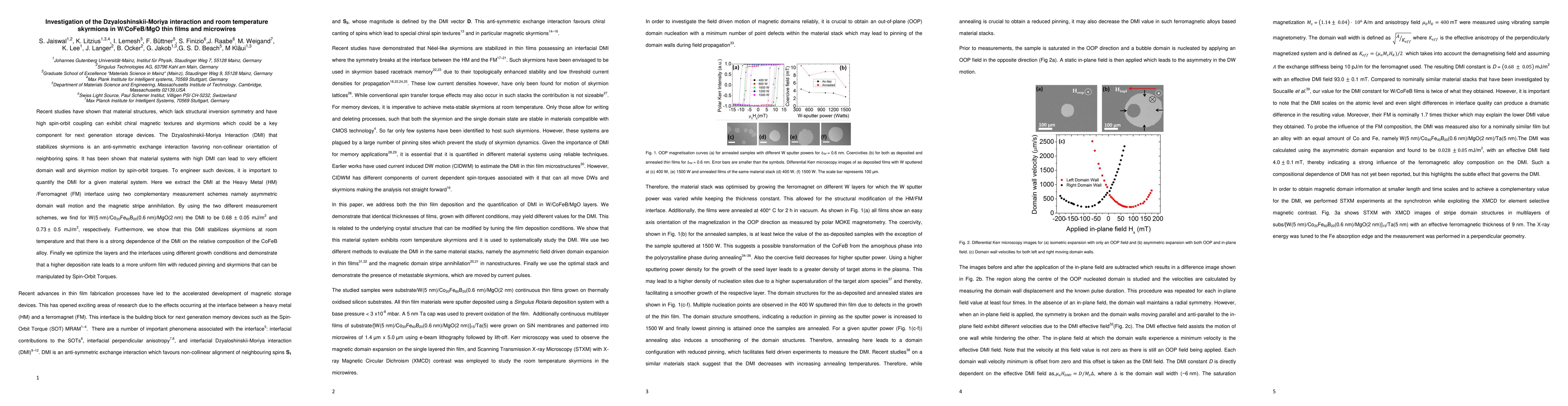 Researchers investigated Dzyaloshinskii-Moriya interaction in W/CoFeB/MgO thin films and microwires, finding a DMI of 0.68-0.73 mJ/m2 that stabilizes room temperature skyrmions, and demonstrated the impact of deposition rate on film uniformity and skyrmion manipulation by Spin-Orbit Torques.