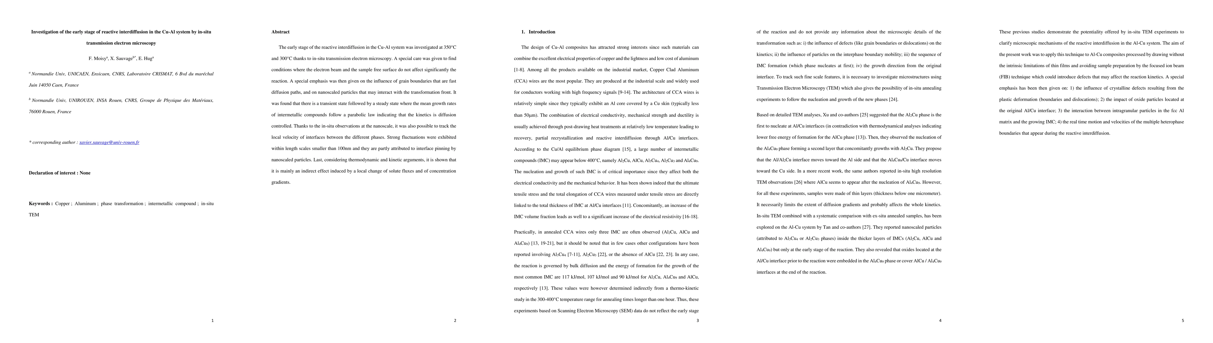The early stage of the reactive interdiffusion in the Cu-Al system was investigated at 350 {\textdegree}C and 300 {\textdegree}C thanks to in-situ transmission electron microscopy. A special care was given to find conditions where the electron beam and the sample free surface do not affect significantly the reaction. A special emphasis was then given on the influence of grain boundaries that are fast diffusion paths, and on nanoscaled particles that may interact with the transformation front. It was found that there is a transient state followed by a steady state where the mean growth rates of intermetallic compounds follow a parabolic law indicating that the kinetics is diffusion controlled. Thanks to the in-situ observations at the nanoscale, it was also possible to track the local velocity of interfaces between the different phases. Strong fluctuations were exhibited within length scales smaller than 100 nm and they are partly attributed to interface pinning by nanoscaled particles. Last, considering thermodynamic and kinetic arguments, it is shown that it is mainly an indirect effect induced by a local change of solute fluxes and of concentration gradients.