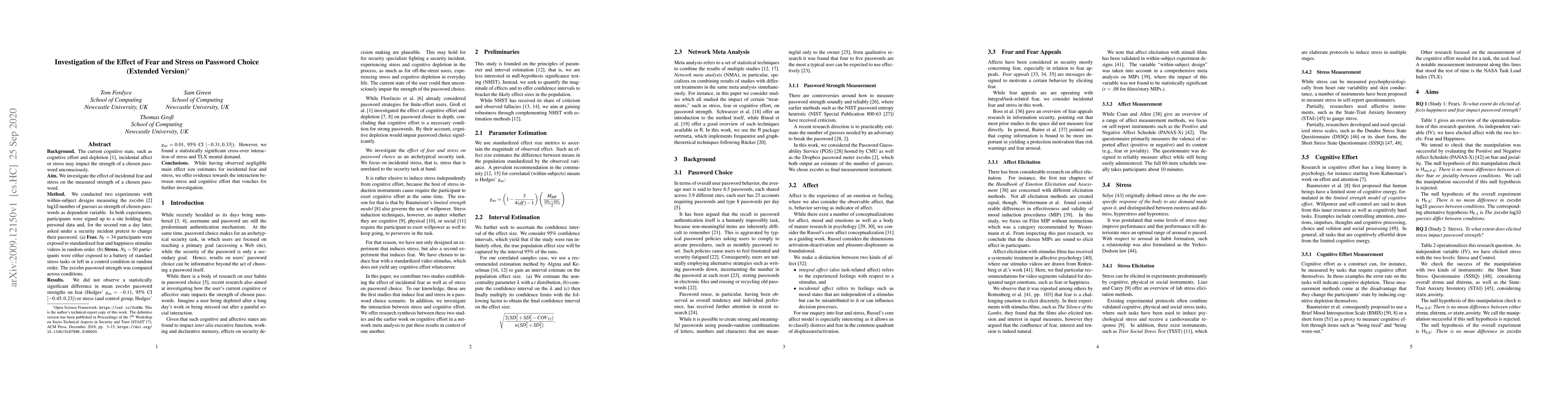 This study investigates the impact of incidental fear and stress on the strength of chosen passwords, finding no significant main effect of fear or stress on password strength. However, it highlights a significant interaction between stress and cognitive effort, suggesting further research is needed.
