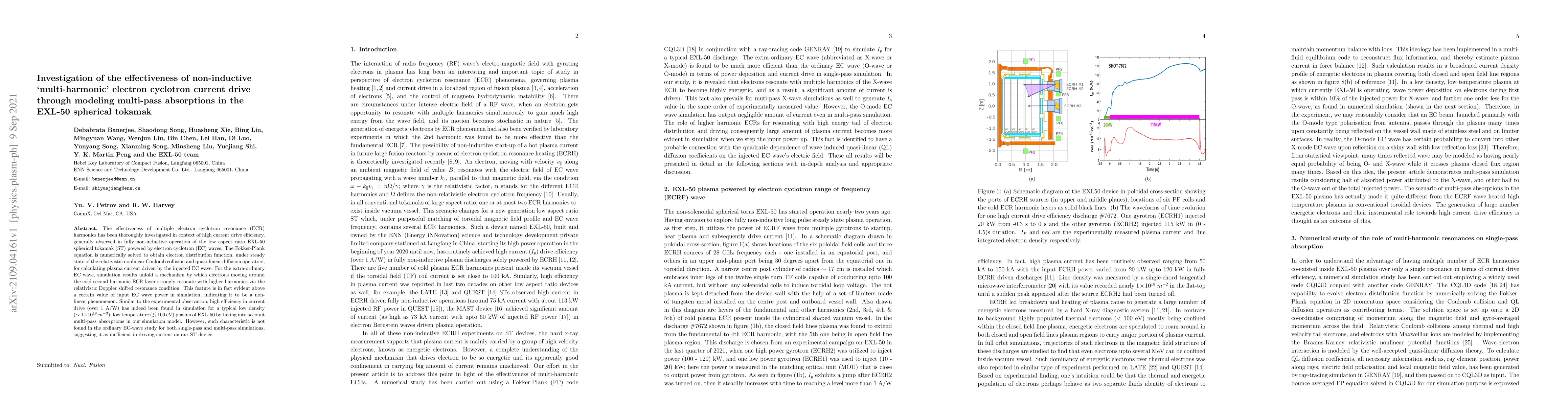 The effectiveness of multiple electron cyclotron resonance (ECR) harmonics has been thoroughly investigated in context of high current drive efficiency, generally observed in fully non-inductive operation of the low aspect ratio EXL-50 spherical tokamak (ST) powered by electron cyclotron (EC) waves. The Fokker-Plank equation is numerically solved to obtain electron distribution function, under steady state of the relativistic nonlinear Coulomb collision and quasi-linear diffusion operators, for calculating plasma current driven by the injected EC wave. For the extra-ordinary EC wave, simulation results unfold a mechanism by which electrons moving around the cold second harmonic ECR layer strongly resonate with higher harmonics via the relativistic Doppler shifted resonance condition. This feature is in fact evident above a certain value of input EC wave power in simulation, indicating it to be a non-linear phenomenon. Similar to the experimental observation, high efficiency in current drive (over 1 A/W) has indeed been found in simulation for a typical low density ($\sim 1\times10^{18}~m^{-3}$), low temperature ($\lesssim 100$ eV) plasma of EXL-50 by taking into account multi-pass absorptions in our simulation model. However, such characteristic is not found in the ordinary EC-wave study for both single-pass and multi-pass simulations, suggesting it as inefficient in driving current on our ST device.