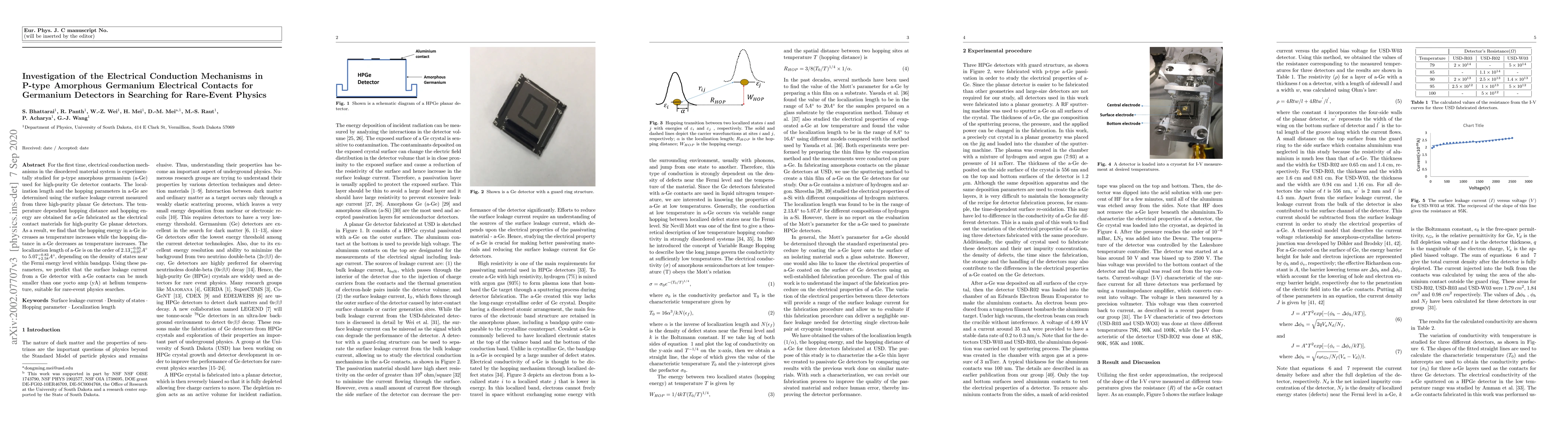 This study investigates the electrical conduction mechanisms in p-type amorphous germanium (a-Ge) used for Ge detector contacts, finding that hopping energy increases with temperature while hopping distance decreases. The localization length is determined to be on the order of $2.13^{-0.05}_{+0.07} A^\circ$ to $5.07^{-0.83}_{+2.58}A^\circ$, leading to predictions of minimal surface leakage current suitable for rare-event physics searches.