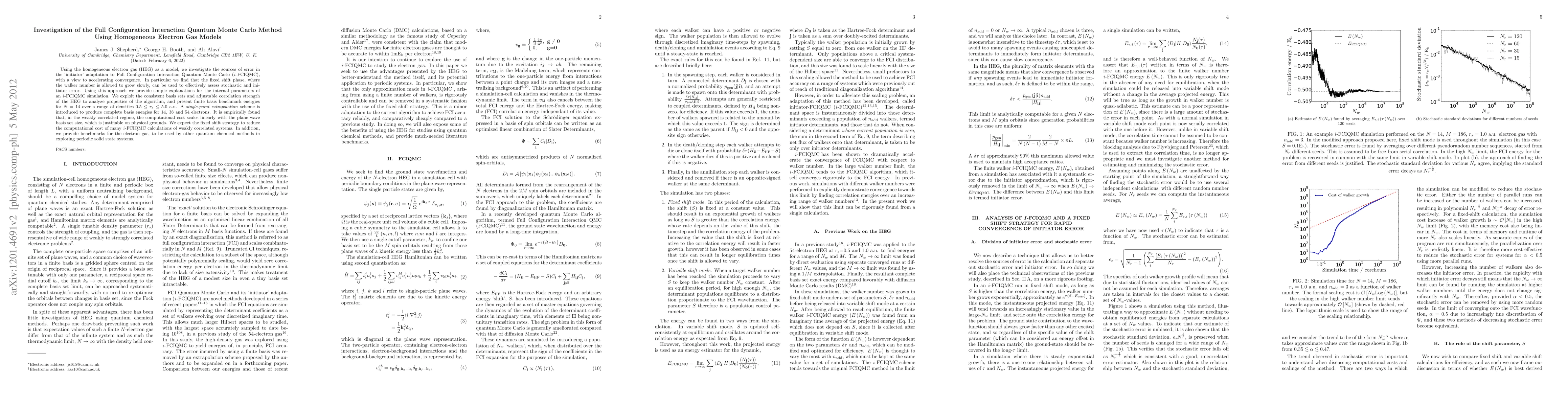 This paper explores the Full Configuration Interaction Quantum Monte Carlo (i-FCIQMC) method using homogeneous electron gas models, focusing on error sources and convergence acceleration. It introduces a fixed shift phase to assess stochastic and initiator error, providing insights into i-FCIQMC parameters and benchmarks for electron gas systems.