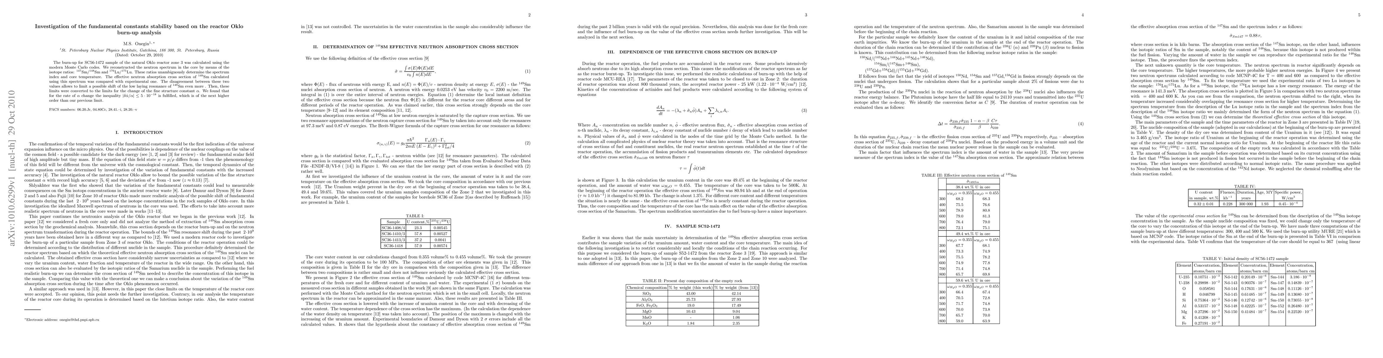 The burn-up for SC56-1472 sample of the natural Oklo reactor zone 3 was calculated using the modern Monte Carlo codes. We reconstructed the neutron spectrum in the core by means of the isotope ratios: $^{147}$Sm/$^{148}$Sm and $^{176}$Lu/$^{175}$Lu. These ratios unambiguously determine the spectrum index and core temperature. The effective neutron absorption cross section of $^{149}$Sm calculated using this spectrum was compared with experimental one. The disagreement between these two values allows to limit a possible shift of the low laying resonance of $^{149}$Sm even more . Then, these limits were converted to the limits for the change of the fine structure constant $\alpha$. We found that for the rate of $\alpha$ change the inequality $|\delta \dot{\alpha}/\alpha| \le 5\cdot 10^{-18}$ is fulfilled, which is of the next higher order than our previous limit.