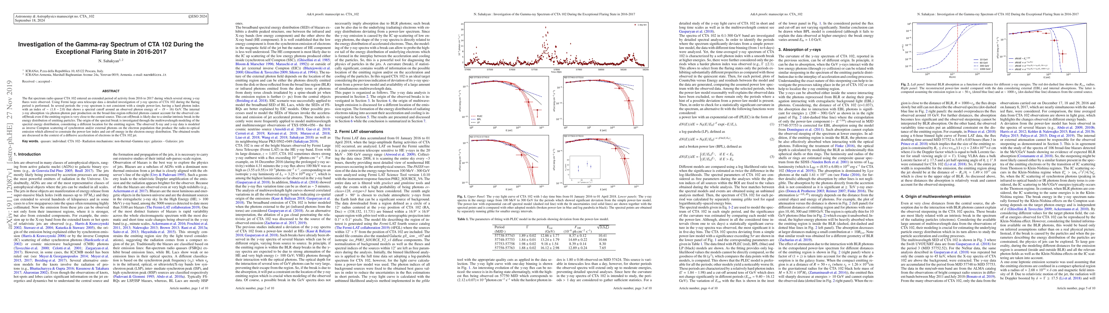 The flat spectrum radio quasar CTA 102 entered an extended period of activity from 2016 to 2017 during which several strong $\gamma$-ray flares were observed. Using Fermi large area telescope data a detailed investigation of \gray spectra of CTA 102 during the flaring period is performed. In several periods the \gray spectrum is not consistent with a simple power-law, having a hard photon index with an index of $\sim(1.8-2.0)$ that shows a spectral cutoff around an observed photon energy of $\sim(9-16)$ GeV. The internal $\gamma$-ray absorption via photon-photon pair production on the broad-line-region-reflected photons cannot account for the observed cut-off/break even if the emitting region is very close to the central source. This cut-off/break is likely due to a similar intrinsic break in the energy distribution of emitting particles. The origin of the spectral break is investigated through the multiwavelength modeling of the spectral energy distribution, considering a different location for the emitting region. The observed X-ray and $\gamma$-ray data is modeled as inverse Compton scattering of synchrotron and/or external photons on the electron population that produce the radio-to-optical emission which allowed to constrain the power-law index and cut-off energy in the electron energy distribution. The obtained results are discussed in the context of a diffusive acceleration of electrons in the CTA 102 jet.