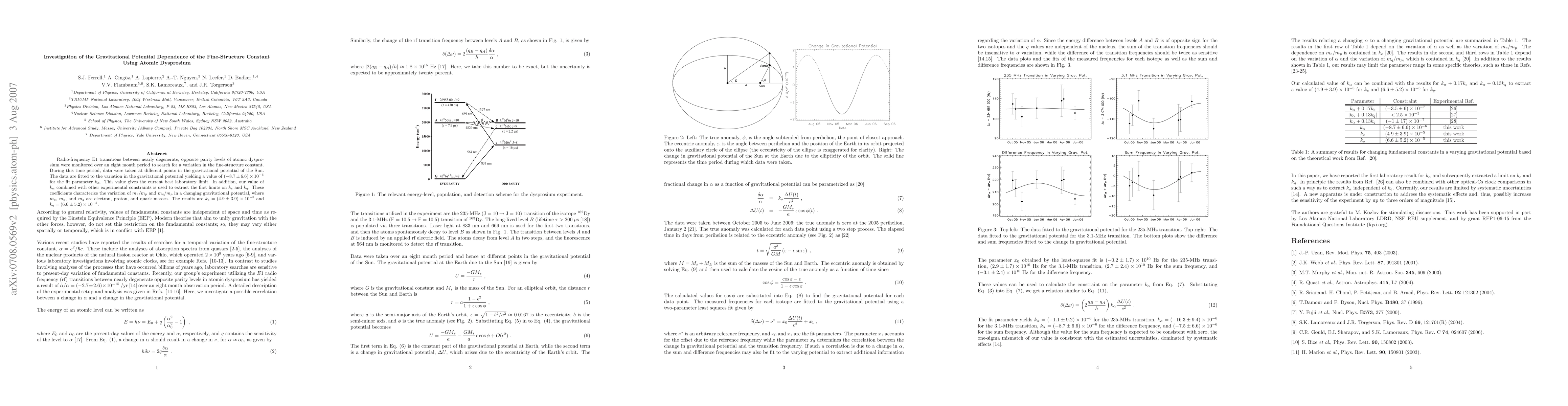 This study investigates the dependence of the fine-structure constant on gravitational potential using atomic dysprosium, yielding a limit of $(-8.7 \pm 6.6) \times 10^{-6}$ for $k_\alpha$. The results also provide new constraints on $k_e$ and $k_q$, characterizing mass variations with gravitational potential.
