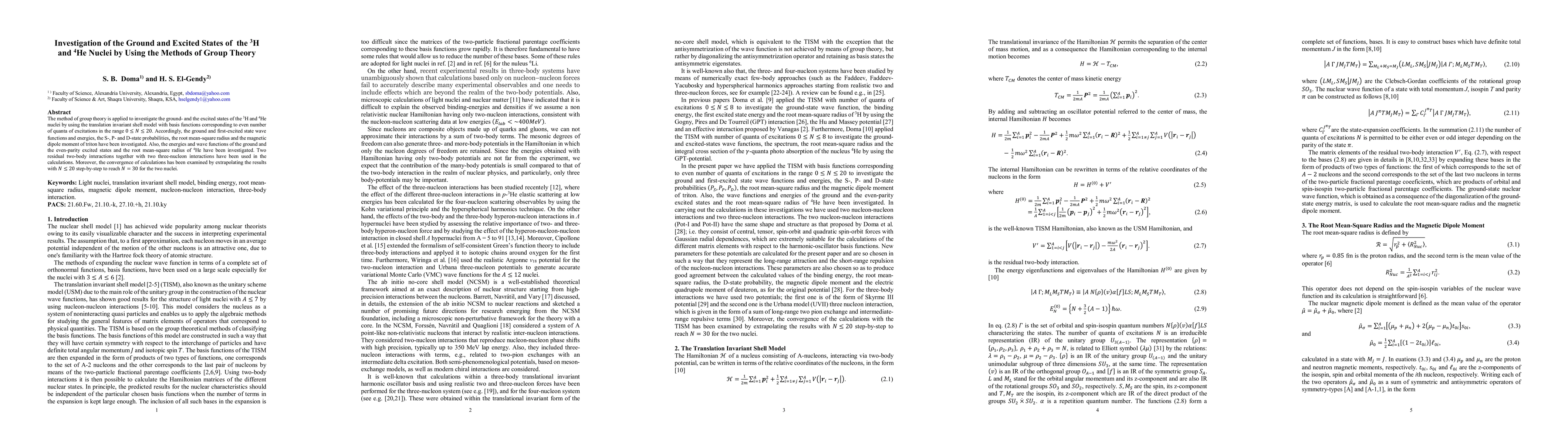 The method of group theory is applied to investigate the ground and the excited states of the triton and helium nuclei by using the translation invariant shell model with basis functions corresponding to even number of quanta of excitations in the range 0 less than or equal to N less than or equal to 20. Accordingly, the ground and first excited state wave functions and energies, the S, P and D state probabilities, the root mean square radius and the magnetic dipole moment of triton have been investigated. Also, the energies and wave functions of the ground and the even parity excited states and the root mean square radius of helium have been investigated. Two residual two body interactions together with two three nucleon interactions have been used in the calculations. Moreover, the convergence of calculations has been examined by extrapolating the results with N less than or equals to 20 step by step to reach N equals to 30 for the two nuclei.