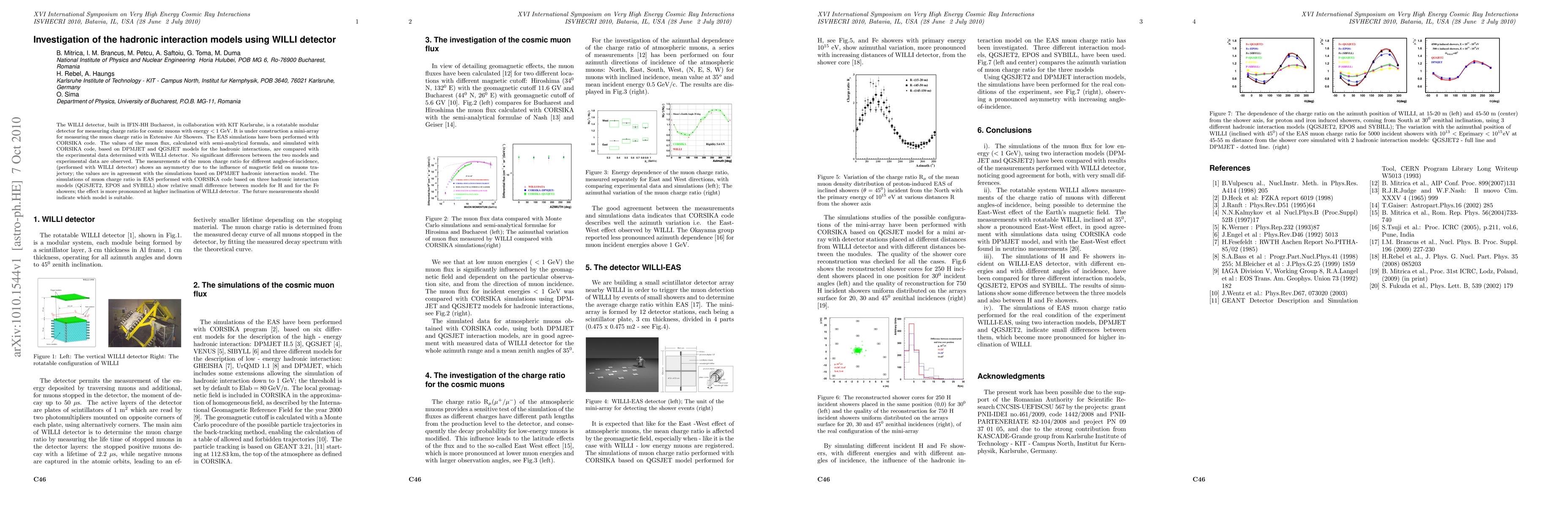 The WILLI detector, built in IFIN-HH Bucharest, in collaboration with KIT Karlsruhe, is a rotatable modular detector for measuring charge ratio for cosmic muons with energy $<$ 1 GeV. It is under construction a mini-array for measuring the muon charge ratio in Extensive Air Showers. The EAS simulations have been performed with CORSIKA code. The values of the muon flux, calculated with semi-analytical formula, and simulated with CORSIKA code, based on DPMJET and QGSJET models for the hadronic interactions, are compared with the experimental data determined with WILLI detector. No significant differences between the two models and experimental data are observed. The measurements of the muon charge ratio for different angles-of-incidence, (performed with WILLI detector) shows an asymmetry due to the influence of magnetic field on muons trajectory; the values are in agreement with the simulations based on DPMJET hadronic interaction model. The simulations of muon charge ratio in EAS performed with CORSIKA code based on three hadronic interaction models (QGSJET2, EPOS and SYBILL) show relative small difference between models for H and for the Fe showers; the effect is more pronounced at higher inclination of WILLI detector. The future measurements should indicate which model is suitable.