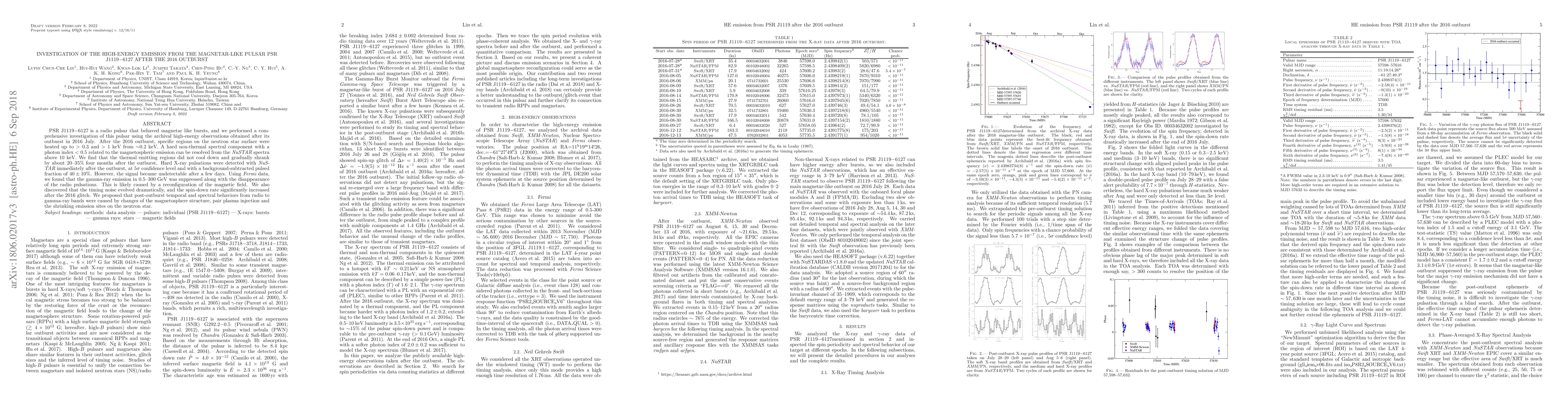 PSR J1119-6127 is a radio pulsar that behaved magnetar like bursts, and we performed a comprehensive investigation of this pulsar using the archival high-energy observations obtained after its outburst in 2016 July. After the 2016 outburst, specific regions on the neutron star surface were heated up to > 0.3 and > 1 keV from about 0.2 keV. A hard non-thermal spectral component with a photon index < 0.5 related to the magnetospheric emission can be resolved from the NuSTAR spectra above 10 keV. We find that the thermal emitting regions did not cool down and gradually shrank by about (20-35)% four months after the outburst. Hard X-ray pulsations were detected with NuSTAR immediately after the outburst, at 5 sigma confidence level and with a background-subtracted pulsed fraction of (40+-10)%. However, the signal became undetectable after a few days. Using Fermi data, we found that the gamma-ray emission in 0.5-300 GeV was suppressed along with the disappearance of the radio pulsations. This is likely caused by a reconfiguration of the magnetic field. We also discovered that the timing noise evolved dramatically, and the spin-down rate significantly increased after the 2016 glitch. We proposed that post-outburst temporal and spectral behaviors from radio to gamma-ray bands were caused by changes of the magnetosphere structure, pair plasma injection and the shrinking emission sites on the neutron star.