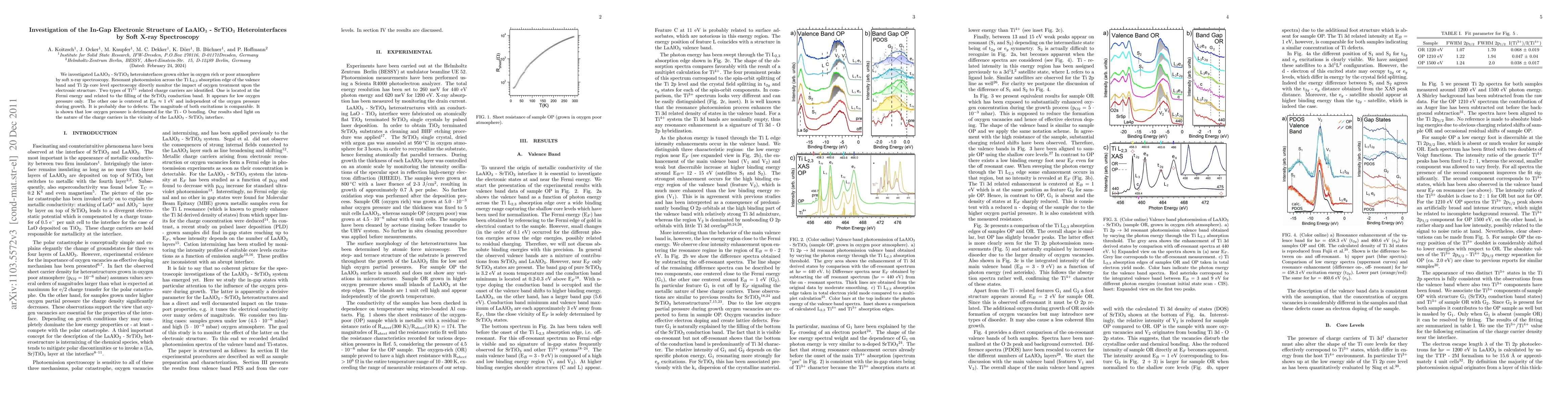 We investigated \LAO\ - \STO\ heterointerfaces grown either in oxygen rich or poor atmosphere by soft x-ray spectroscopy. Resonant photoemission across the Ti L$_{2,3}$ absorption edge of the valence band and Ti 2p core level spectroscopy directly monitor the impact of oxygen treatment upon the electronic structure. Two types of Ti$^{3+}$ related charge carriers are identified. One is located at the Fermi energy and related to the filling of the \STO\ conduction band. It appears for low oxygen pressure only. The other one is centered at E$_{B}$ $\approx$ 1 eV and independent of the oxygen pressure during growth. It is probably due to defects. The magnitude of both excitations is comparable. It is shown that low oxygen pressure is detrimental for the Ti - O bonding. Our results shed light on the nature of the charge carriers in the vicinity of the \LAO\ - \STO\ interface.