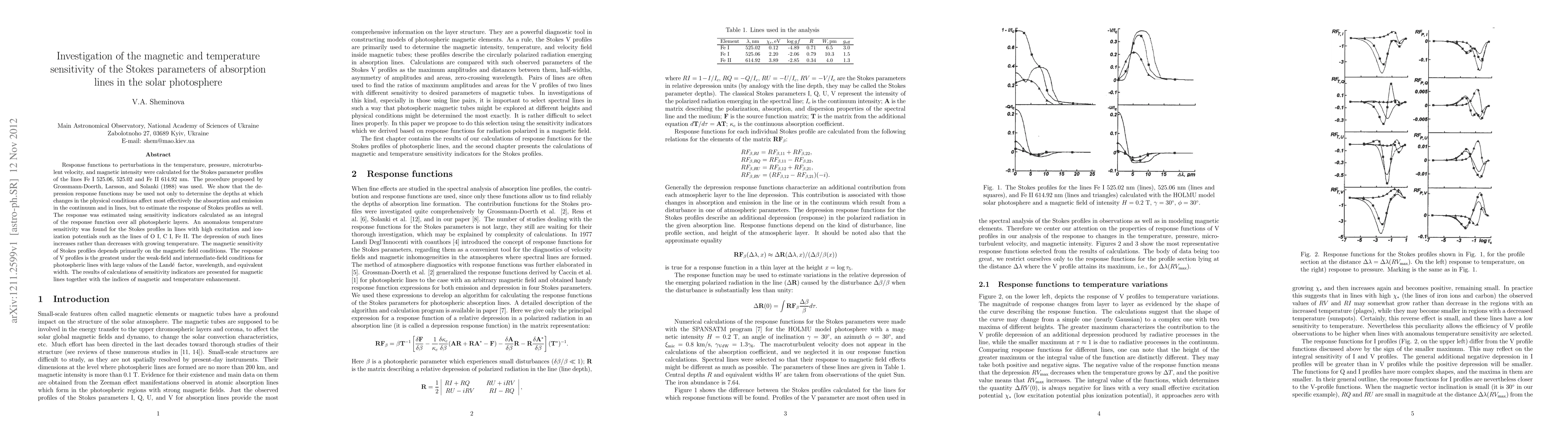 This paper investigates the magnetic and temperature sensitivity of the Stokes parameters for absorption lines in the solar photosphere, finding that depression response functions can determine the depths of physical condition changes affecting absorption and emission. Anomalous temperature sensitivity is observed in lines with high excitation and ionization potentials, while magnetic sensitivity is most pronounced under weak-field and intermediate-field conditions for lines with large Lande factors, wavelengths, and equivalent widths.