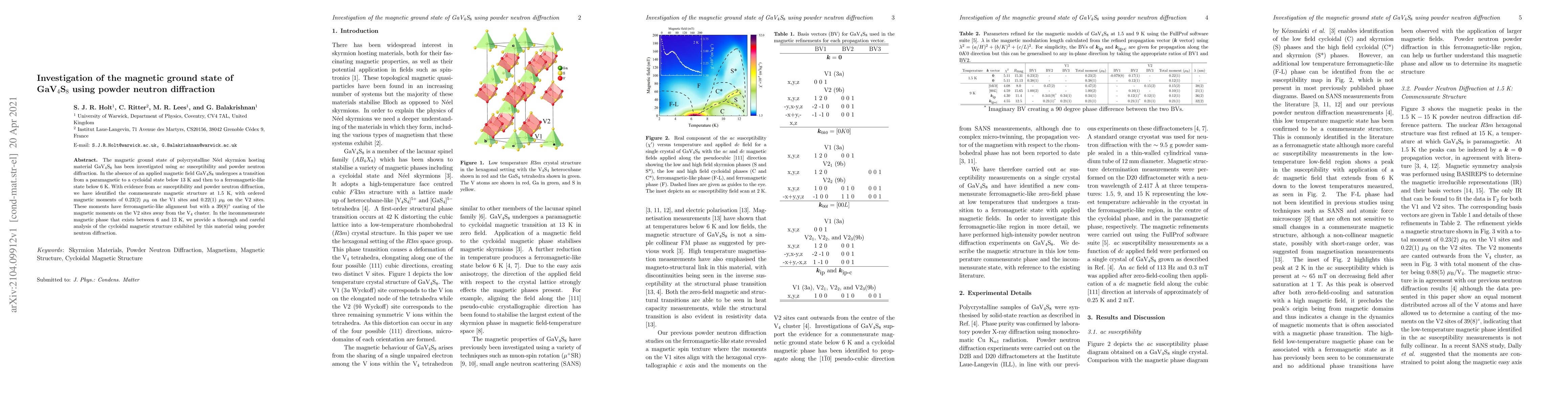 This study investigates the magnetic ground state of GaV$_4$S$_8$ using ac susceptibility and powder neutron diffraction, revealing a transition from paramagnetic to cycloidal and then to a ferromagnetic-like state below 13 K and 6 K, respectively. The material exhibits a commensurate magnetic structure at 1.5 K with specific magnetic moment alignments.