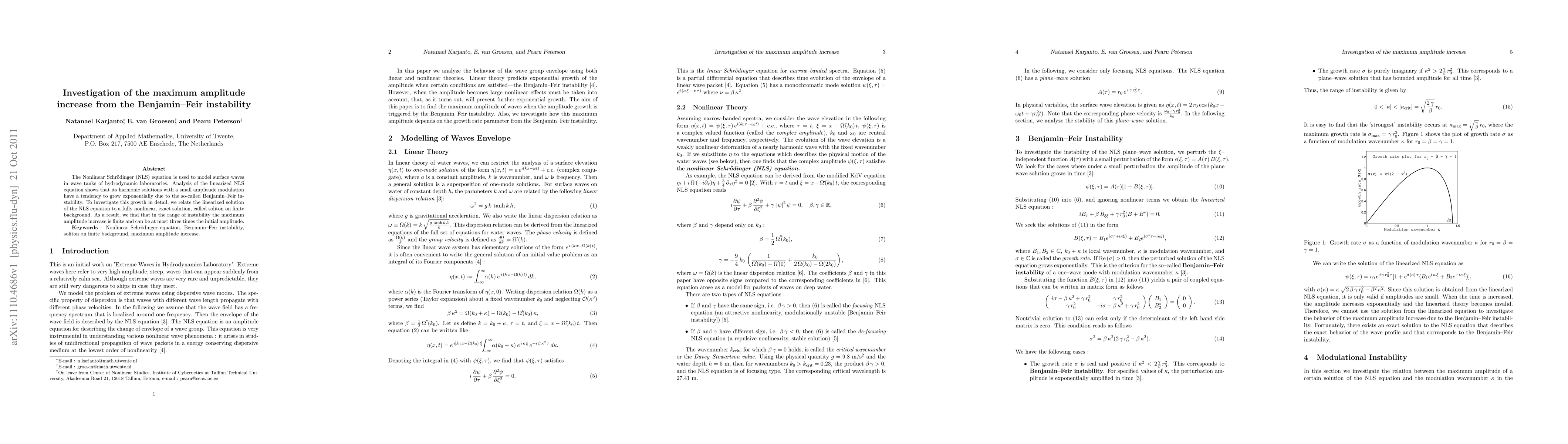 The study investigates the maximum amplitude increase due to the Benjamin-Feir instability in surface waves using the Nonlinear Schrödinger equation. It finds that the maximum amplitude increase is finite, reaching at most three times the initial amplitude.