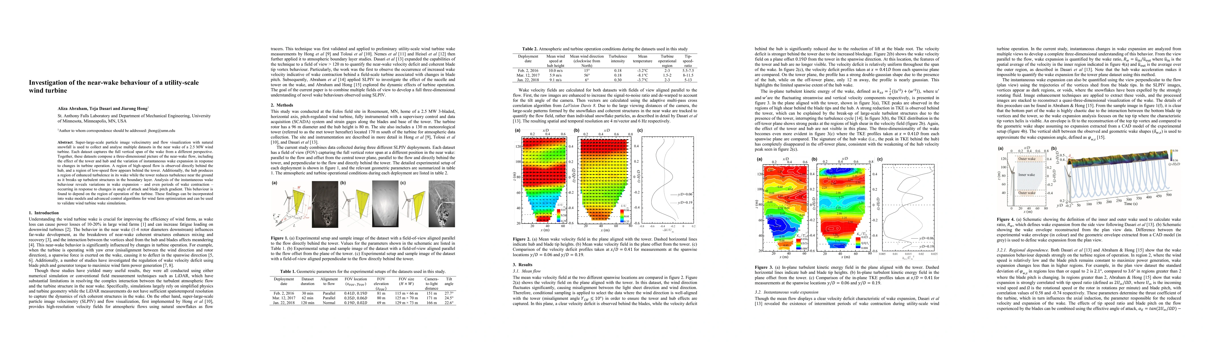 This paper investigates the near-wake behaviour of a utility-scale wind turbine using advanced particle image velocimetry and natural snowfall, revealing complex flow patterns including high-speed flow behind the hub and low-speed flow behind the tower, with implications for turbine operation optimization and wake simulation validation.
