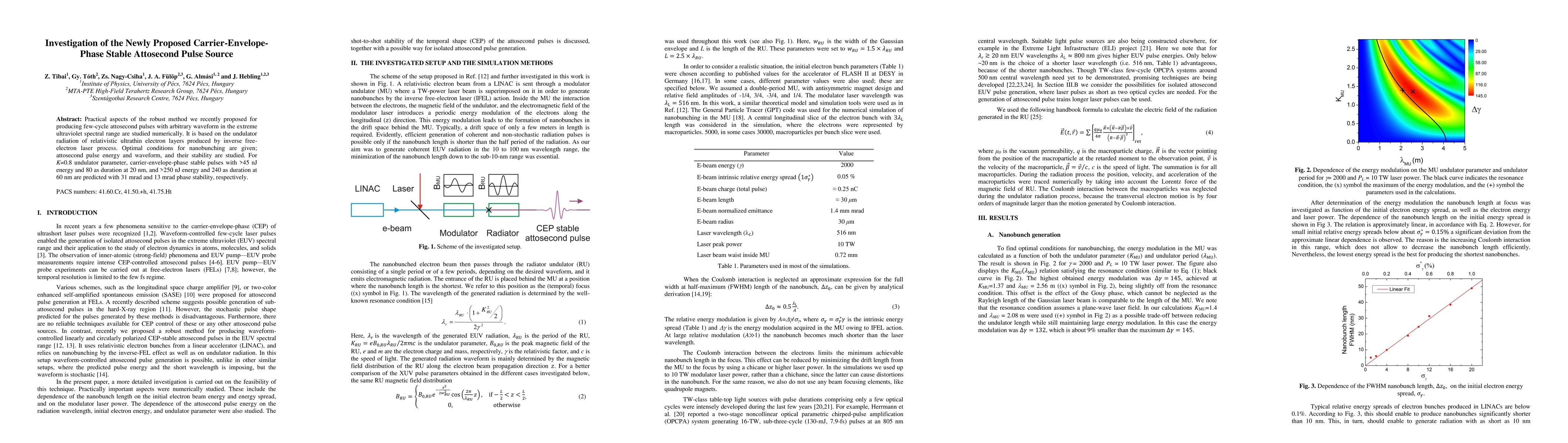 Practical aspects of the robust method we recently proposed for producing few-cycle attosecond pulses with arbitrary waveform in the extreme ultraviolet spectral range are studied numerically. It is based on the undulator radiation of relativistic ultrathin electron layers produced by inverse free-electron laser process. Optimal conditions for nanobunching are given; attosecond pulse energy and waveform, and their stability are studied. For K=0.8 undulator parameter, carrier-envelope-phase stable pulses with >45 nJ energy and 80 as duration at 20 nm, and >250 nJ energy and 240 as duration at 60 nm are predicted with 31 mrad and 13 mrad phase stability, respectively.