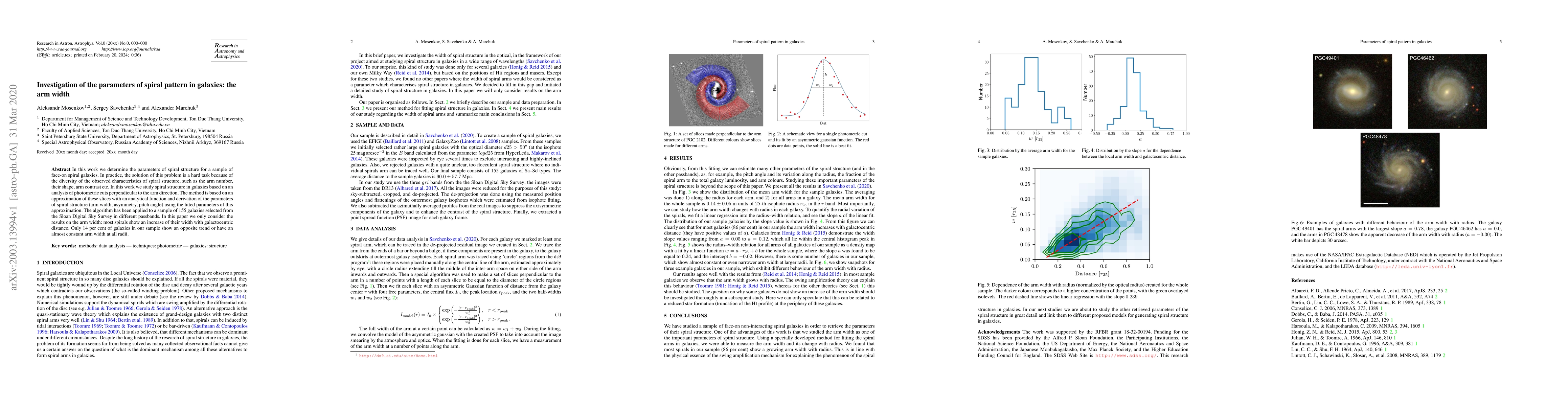 This paper investigates the arm width in spiral galaxies using photometric cuts and analytical approximations, finding that most spiral arms widen with increasing galactocentric distance, while only 14% exhibit constant or decreasing arm width.