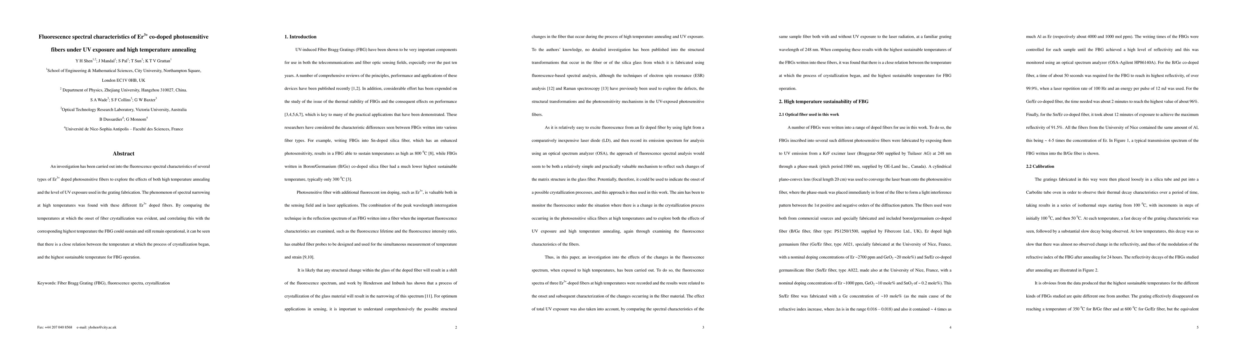This paper investigates the photosensitivity, temperature sustainability, and fluorescence characteristics of three types of Er-doped photosensitive fibers: Ge/Er, Sn/Er, and Sb/Er. The study demonstrates their suitability for optical sensor systems, showing significant photosensitivity and fluorescence emission in the 1550 nm band, with high temperature sustainability up to 850°C, particularly for Sn/Er and Sb/Er fibers.