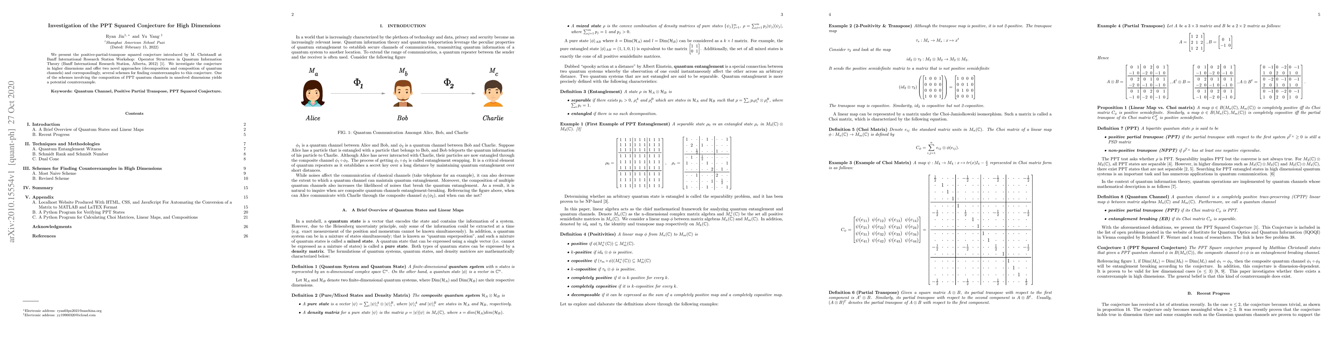 Researchers investigate the PPT Squared Conjecture in higher dimensions, proposing novel approaches to find counterexamples, including a scheme involving the composition of quantum channels that yields a potential counterexample.