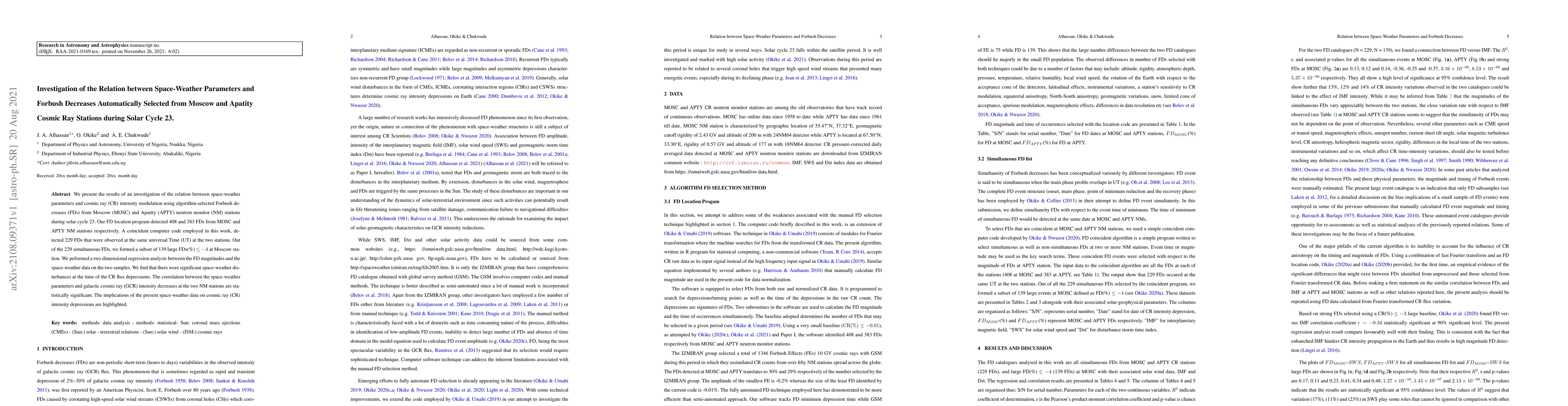 We present the results of an investigation of the relation between space-weather parameters and cosmic ray (CR) intensity modulation using algorithm-selected Forbush decreases (FDs) from Moscow (MOSC) and Apatity (APTY) neutron monitor (NM) stations during solar cycle 23. Our FD location program detected 408 and 383 FDs from MOSC and APTY NM stations respectively. A coincident computer code employed in this work, detected 229 FDs that were observed at the same universal Time (UT) at the two stations. Out of the 229 simultaneous FDs, we formed a subset of 139 large FDs(\%) $\leq-4$ at Moscow station. We peformed a two dimensional regression analysis between the FD magnitudes and the space-weather data on the two samples. We find that there were significant space-weather disturbances at the time of the CR flux depressions. The correlation between the space-weather parameters and galactic cosmic ray (GCR) intensity decreases at the two NM stations are statistically significant. The implications of the present space-weather data on cosmic ray (CR) intensity depressions are highlighted.
