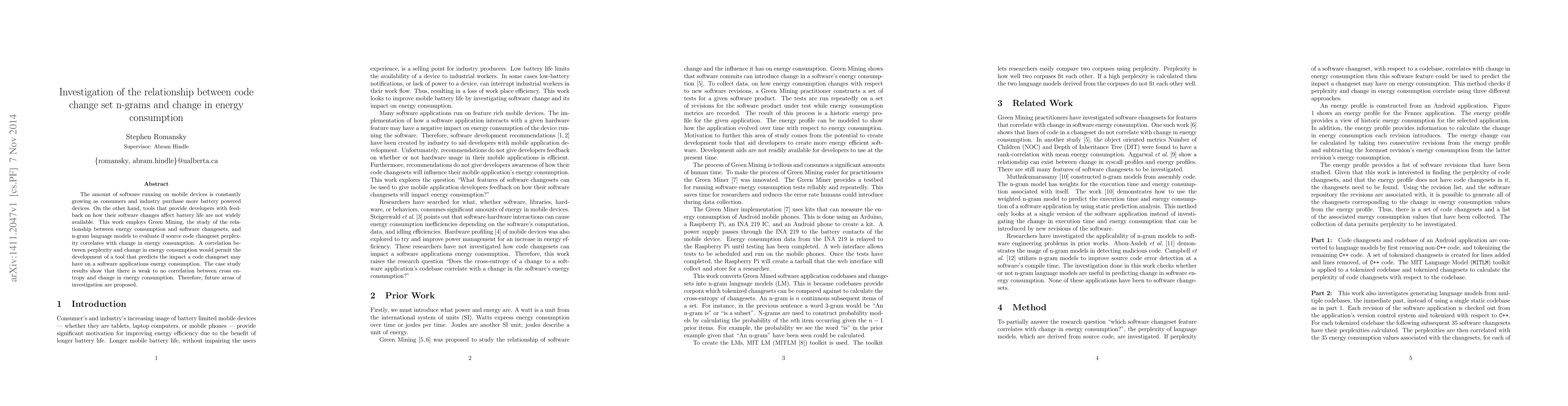 The amount of software running on mobile devices is constantly growing as consumers and industry purchase more battery powered devices. On the other hand, tools that provide developers with feed- back on how their software changes affect battery life are not widely available. This work employs Green Mining, the study of the rela- tionship between energy consumption and software changesets, and n-gram language models to evaluate if source code changeset perplex- ity correlates with change in energy consumption. A correlation be- tween perplexity and change in energy consumption would permit the development of a tool that predicts the impact a code changeset may have on a software applications energy consumption. The case study results show that there is weak to no correlation between cross en- tropy and change in energy consumption. Therefore, future areas of investigation are proposed.
