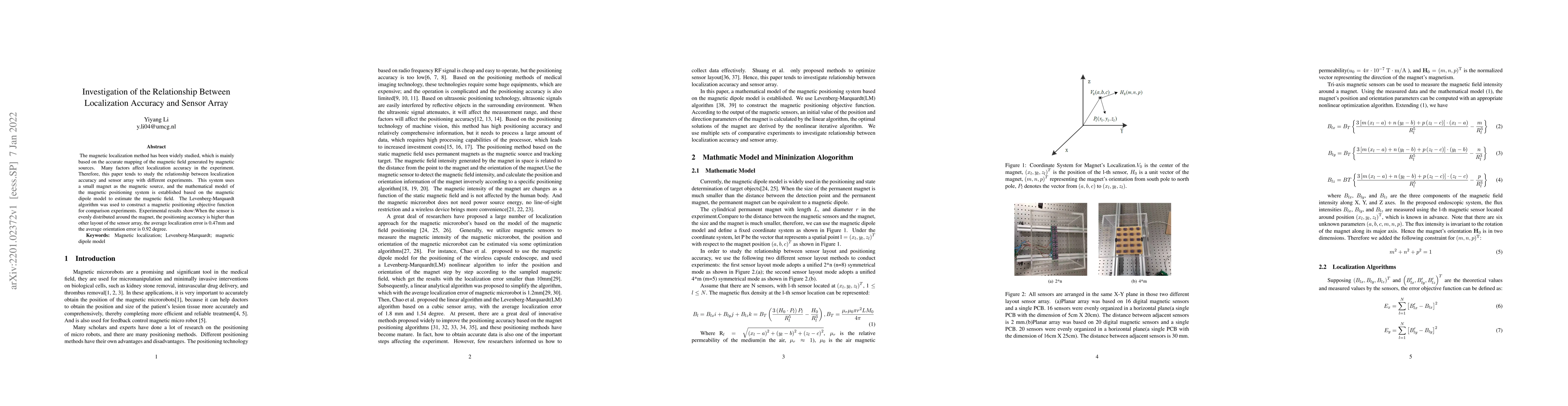 The magnetic localization method has been widely studied, which is mainly based on the accurate mapping of the magnetic field generated by magnetic sources. Many factors affect localization accuracy in the experiment. Therefore, this paper tends to study the relationship between localization accuracy and sensor array with different experiments. This system uses a small magnet as the magnetic source, and the mathematical model of the magnetic positioning system is established based on the magnetic dipole model to estimate the magnetic field. The Levenberg-Marquardt algorithm was used to construct a magnetic positioning objective function for comparison experiments. Experimental results show:When the sensor is evenly distributed around the magnet, the positioning accuracy is higher than other layout of the sensor array, the average localization error is 0.47mm and the average orientation error is 0.92 degree.