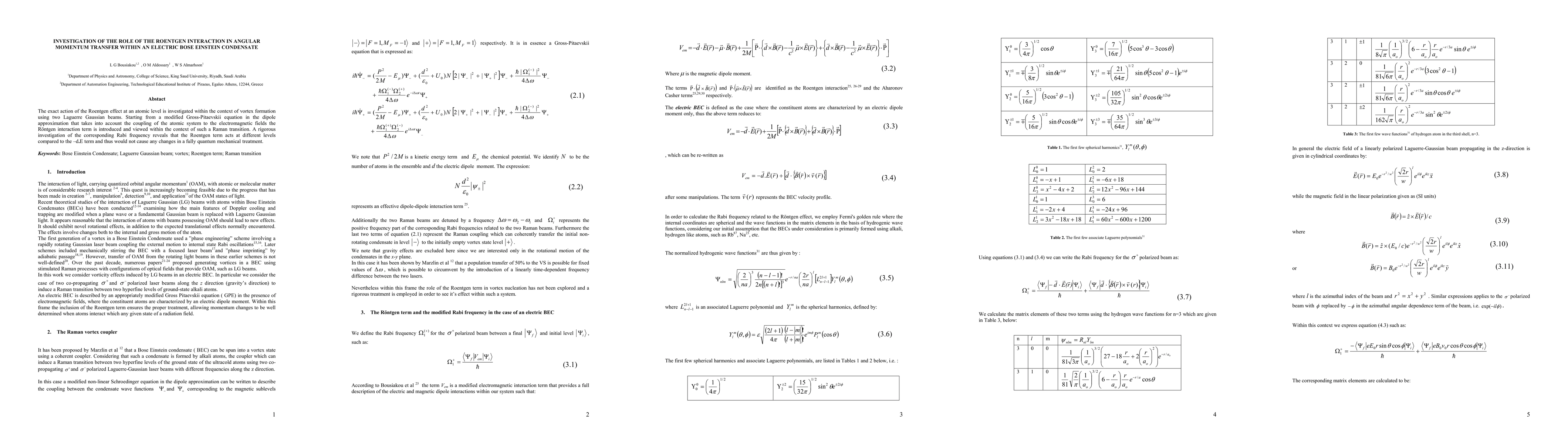 Researchers investigated the role of Roentgen interaction in angular momentum transfer within an electric Bose Einstein Condensate using Laguerre Gaussian beams. They found that the Roentgen term does not affect the behavior in a fully quantum mechanical treatment.