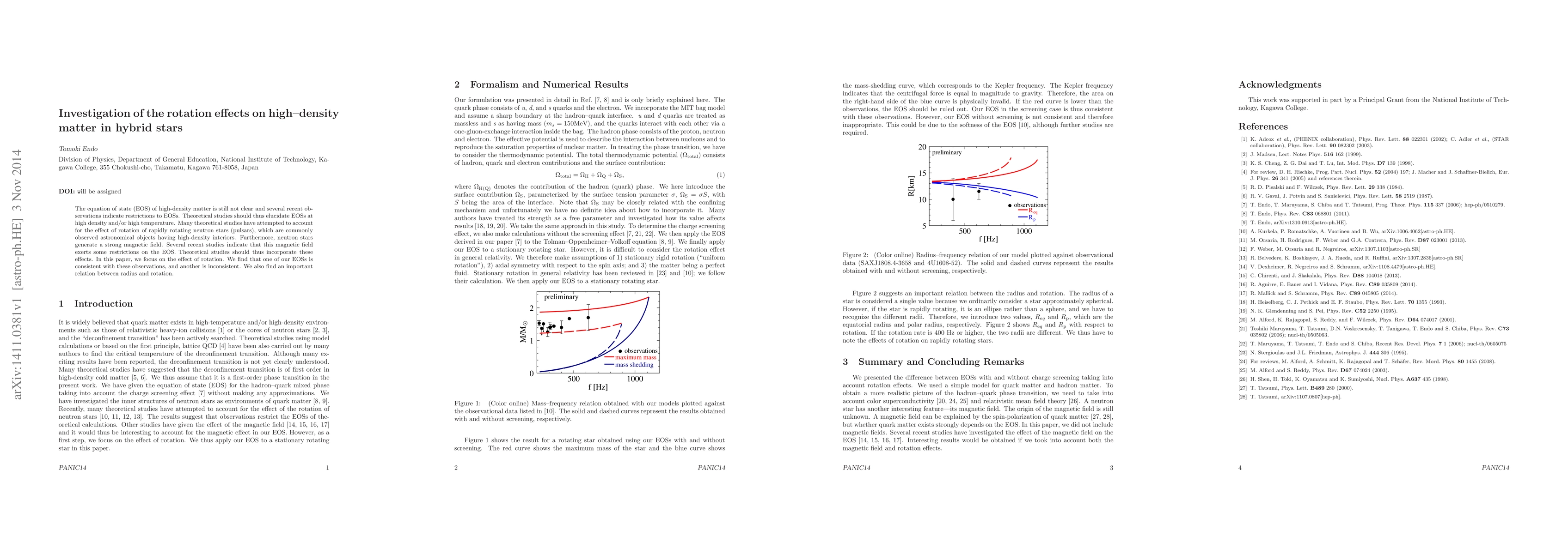 The equation of state (EOS) of high-density matter is still not clear and several recent observations indicate restrictions to EOSs. Theoretical studies should thus elucidate EOSs at high density and/or high temperature. Many theoretical studies have attempted to account for the effect of rotation of rapidly rotating neutron stars (pulsars), which are commonly observed astronomical objects having high-density interiors. Furthermore, neutron stars generate a strong magnetic field. Several recent studies indicate that this magnetic field exerts some restrictions on the EOS. Theoretical studies should thus incorporate these effects. In this paper, we focus on the effect of rotation. We find that one of our EOSs is consistent with these observations, and another is inconsistent. We also find an important relation between radius and rotation.