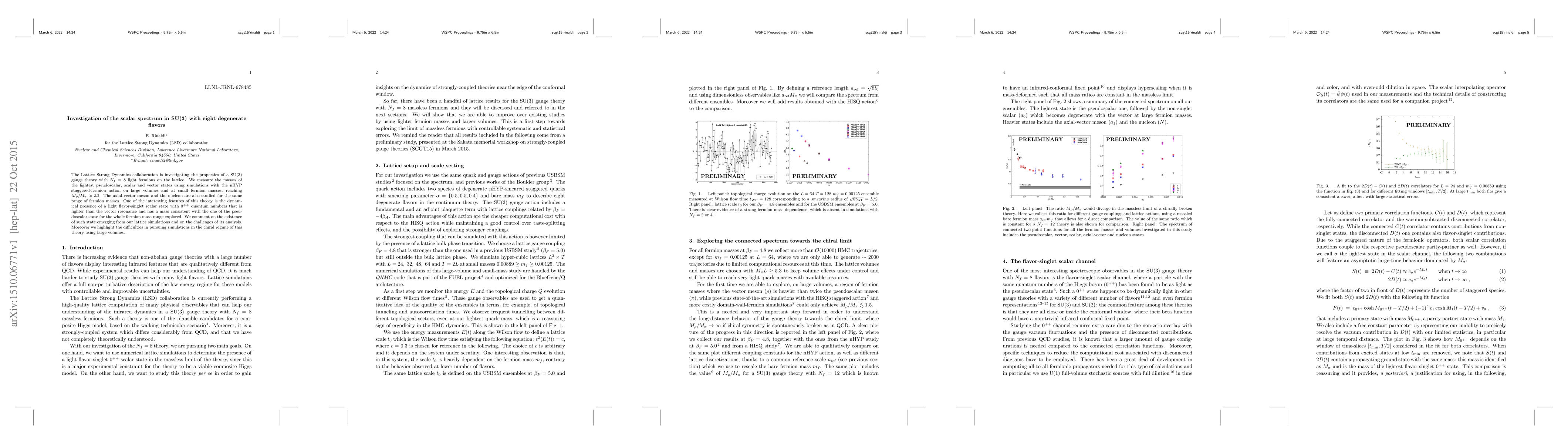 The Lattice Strong Dynamics collaboration is investigating the properties of a SU(3) gauge theory with $N_f = 8$ light fermions on the lattice. We measure the masses of the lightest pseudoscalar, scalar and vector states using simulations with the nHYP staggered-fermion action on large volumes and at small fermion masses, reaching $M_{\rho}/M_{\pi} \approx 2.2$. The axial-vector meson and the nucleon are also studied for the same range of fermion masses. One of the interesting features of this theory is the dynamical presence of a light flavor-singlet scalar state with $0^{++}$ quantum numbers that is lighter than the vector resonance and has a mass consistent with the one of the pseudoscalar state for the whole fermion mass range explored. We comment on the existence of such state emerging from our lattice simulations and on the challenges of its analysis. Moreover we highlight the difficulties in pursuing simulations in the chiral regime of this theory using large volumes.