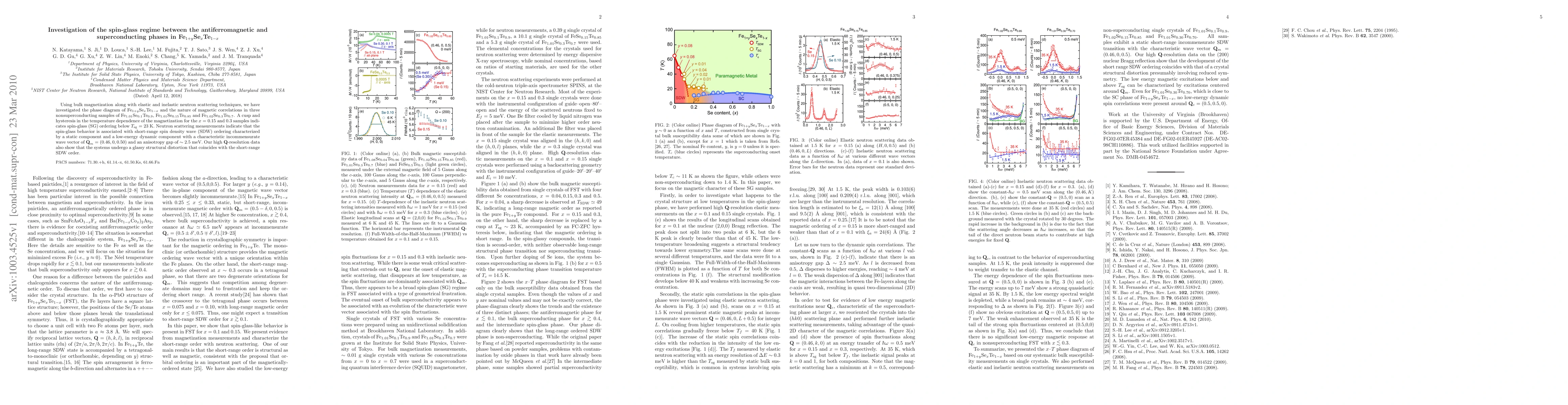 This study investigates the spin-glass regime in Fe$_{1+y}$Se$_{x}$Te$_{1-x}$ using magnetization and neutron scattering, revealing spin-glass ordering below 23K in samples with $x=0.15$ and 0.3. The spin-glass behavior is linked to short-range spin density wave ordering with a characteristic incommensurate wave vector and a structural distortion.