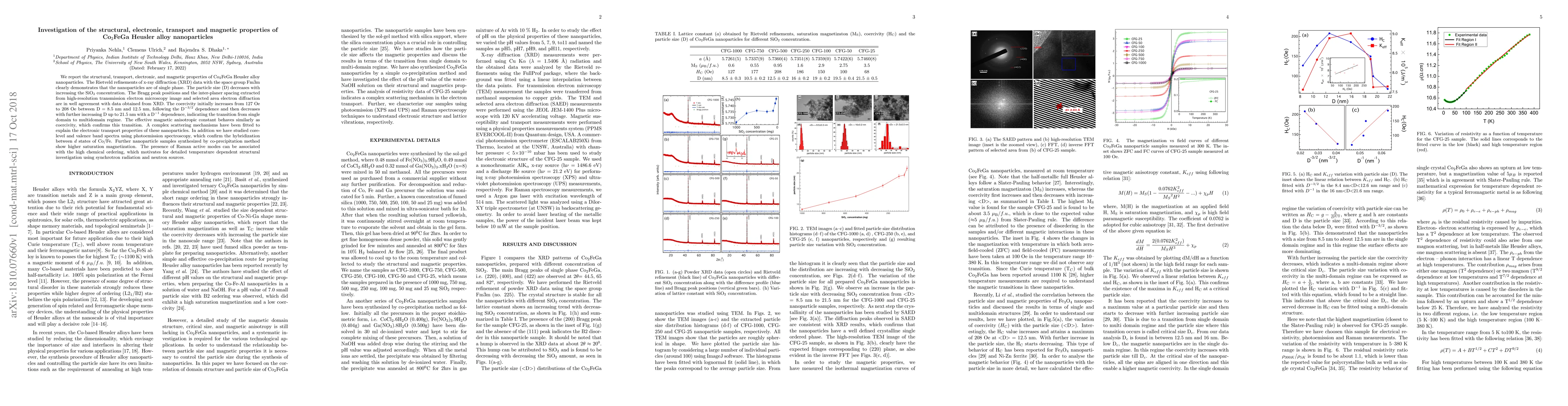 We report the structural, transport, electronic, and magnetic properties of Co$_2$FeGa Heusler alloy nanoparticles. The Rietveld refinements of x-ray diffraction (XRD) data with the space group Fm$\bar {3}$m clearly demonstrates that the nanoparticles are of single phase. The particle size (D) decreases with increasing the SiO$_2$ concentration. The Bragg peak positions and the inter-planer spacing extracted from high-resolution transmission electron microscopy image and selected area electron diffraction are in well agreement with data obtained from XRD. The coercivity initially increases from 127~Oe to 208~Oe between D = 8.5~nm and 12.5~nm, following the D$^{-3/2}$ dependence and then decreases with further increasing D up to 21.5~nm with a D$^{-1}$ dependence, indicating the transition from single domain to multidomain regime. The effective magnetic anisotropic constant behaves similarly as coercivity, which confirms this transition. A complex scattering mechanisms have been fitted to explain the electronic transport properties of these nanoparticles. In addition we have studied core-level and valence band spectra using photoemission spectroscopy, which confirm the hybridization between $d$ states of Co/Fe. Further nanoparticle samples synthesized by co-precipitation method show higher saturation magnetization. The presence of Raman active modes can be associated with the high chemical ordering, which motivates for detailed temperature dependent structural investigation using synchrotron radiation and neutron sources.