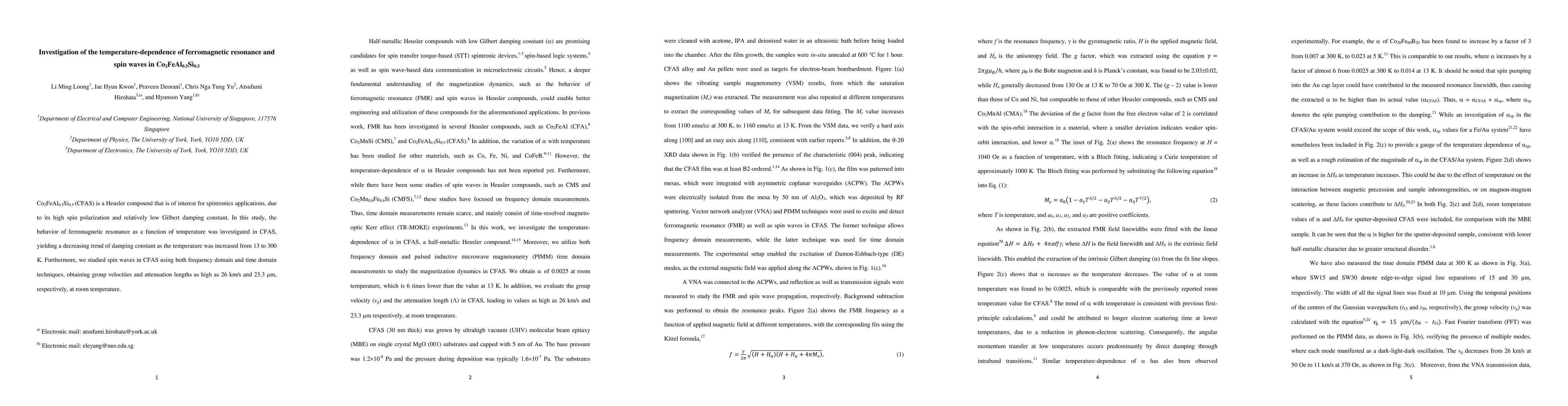 This study investigates the temperature-dependence of ferromagnetic resonance and spin waves in Co2FeAl0.5Si0.5 (CFAS), revealing a decreasing damping constant with increasing temperature. Spin wave analysis shows high group velocities and attenuation lengths, supporting CFAS's potential for spintronics applications.